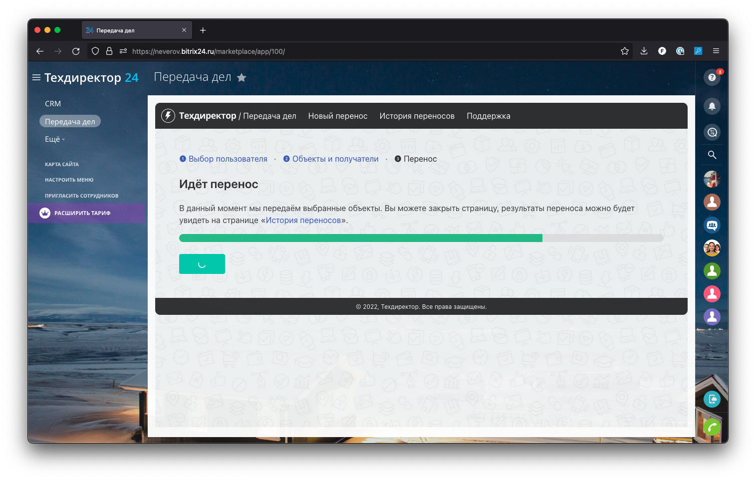Передайте объекты CRM (компании, контакты, лиды, сделки, коммерческие предложения, счета, задачи, дела) от одного сотрудника к другому в два клика при увольнении или уходе в отпуск