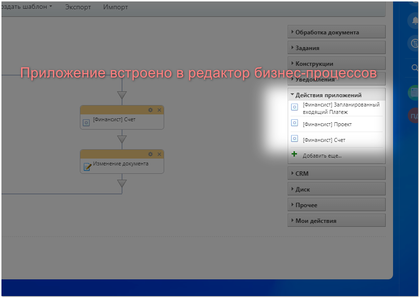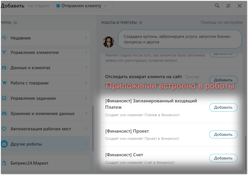 Приложение представляет собою конструктор интеграции между Битрикс24 и сервисом управленческой отчетности Финансист. Вы можете настроить взаимодействие используя роботы или бизнес-процессы, по своему усмотрению самостоятельно или обратившись к партнерам.