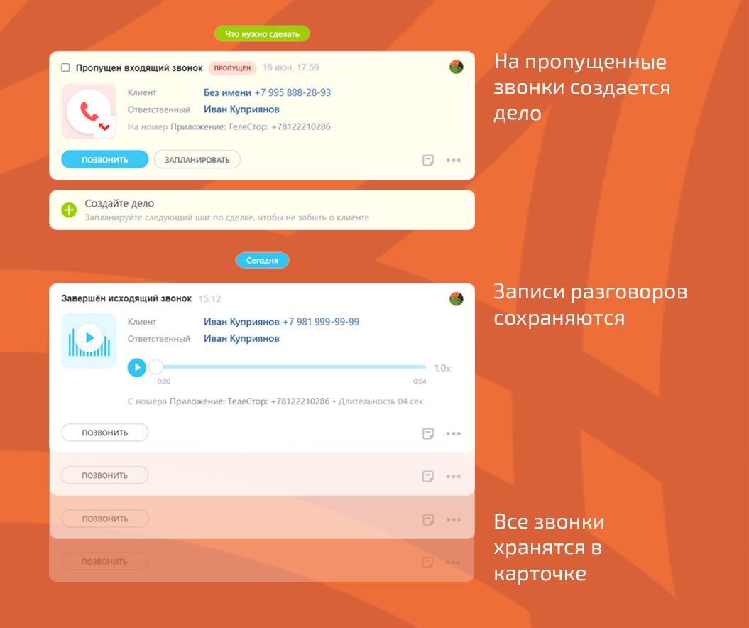 Записывает и сохраняет каждый звонок, прикрепляет его к нужной карточке