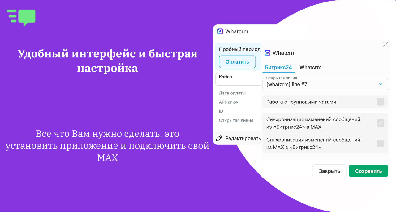 Варианты интеграции:Полная интеграция с "Открытыми линиями" Битрикс24: объедините функционал MAX от Whatcrm и Битрикс24 для бесшовного общения.