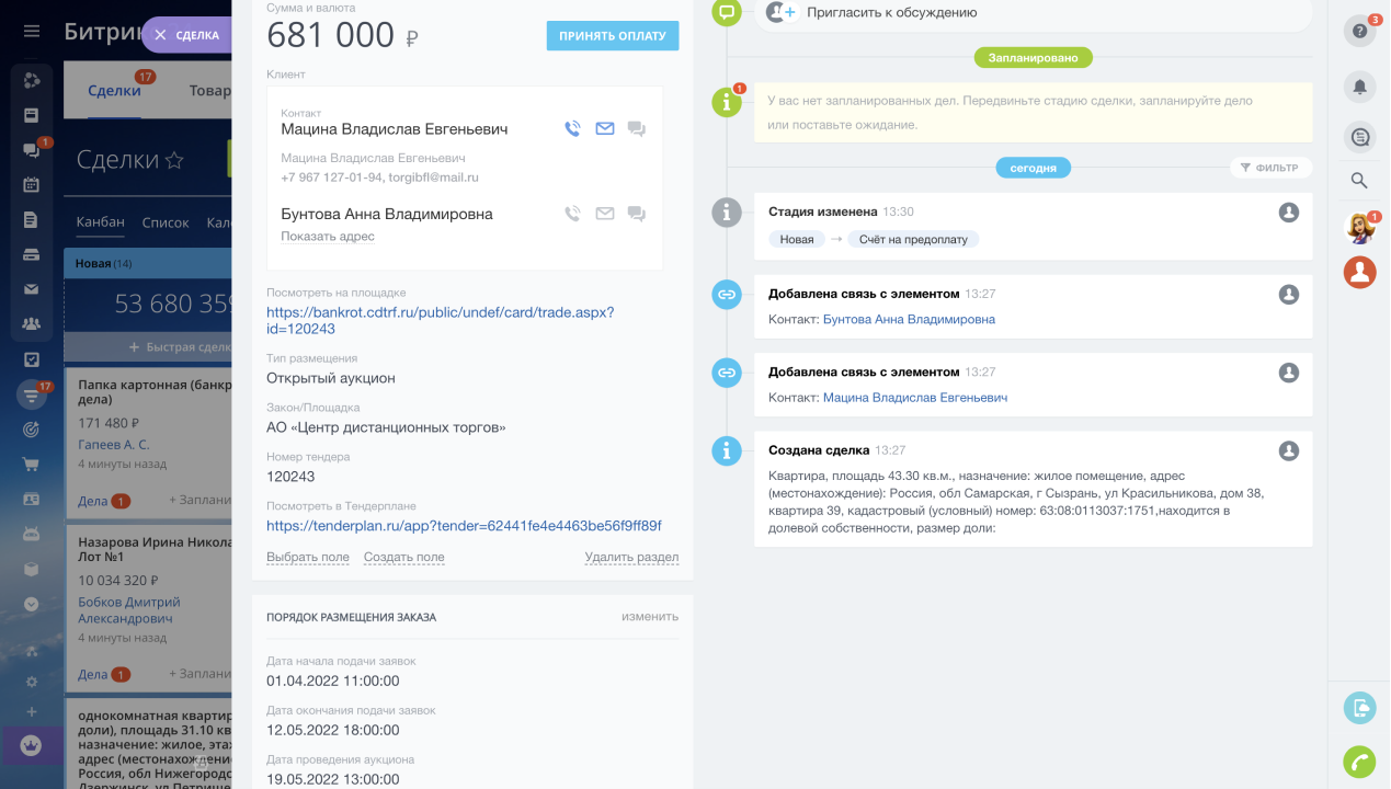 Необходимые контакты по тендеру переносятся в Битрикс 24. Вся коммуникация с заказчиком в карточке, не выходя из CRM.