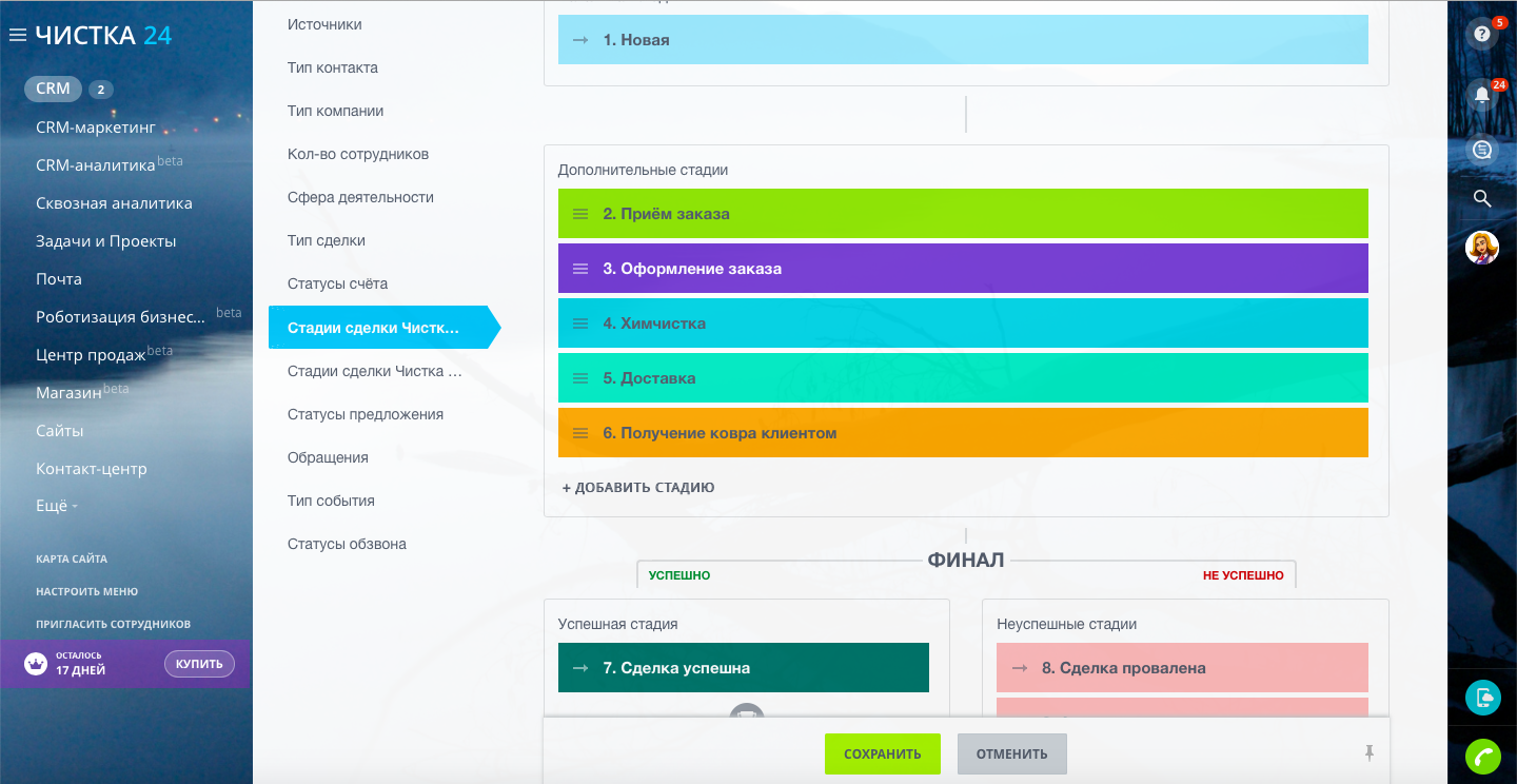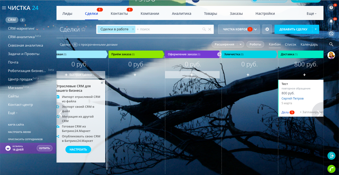 Настроенная CRM для сервисов химчистки ковров и мебели. Автоматизация работы.