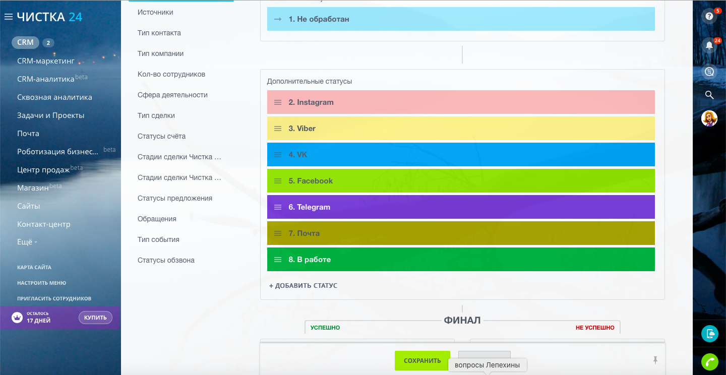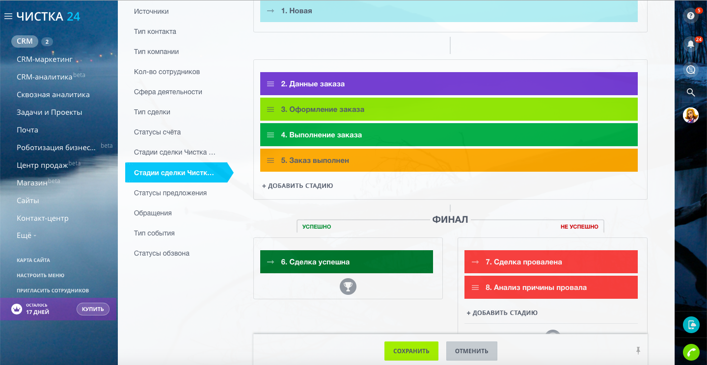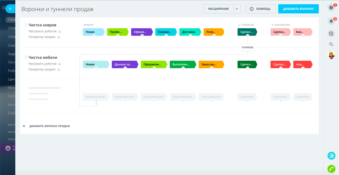 В данной CRM настроено два направления продаж. "Чистка ковров" и "Чистка мебели".