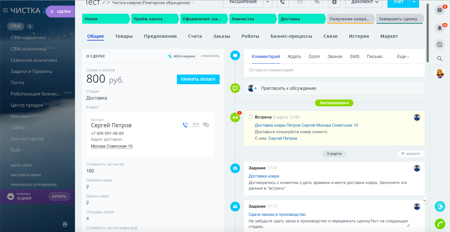 "Чистка ковров"На стадии "Новая" мы автоматически ставим задание менеджеру на заполнение данных клиента (ФИО, адрес забора ковра, желаемое время забора). На стадии "Приём заказа" автоматически назначается встреча (место забора ковра и время) и ставится задание менеджеру поставить время в данной встрече и назначить ответственного курьера или водителя, после заполнения данных водитель/курьер в своем мобильном приложении видит место и время встречи. Далее водителю/курьеру отправляется автоматическое смс с напоминанием. На следующей стадии "Оформление заказа" мы получаем ковер и привозим его на производство, где его оформляем. Делаем обмер и согласовываем стоимость с клиентом. На следующей стадии " Химчистка" автоматически ставится задача производству на чистку ковра, после окончания чистки задача закрывается, и переходим автоматически на следующую стадию. На стадии "Доставка" автоматически назначается встреча (место забора ковра и время), и ставится задание менеджеру поставить время в данной встрече и назначить ответственного курьера или водителя, после заполнения данных водитель/курьер в своем мобильном приложении видит место и время встречи. Далее водителю/курьеру отправляется автоматическое смс с напоминанием. После доставки и расчёта с клиентом мы переводим сделку на следующую стадию. На следующей стадии "Получение ковра" ставится автоматически задача на оформление документов по сделке, после закрытия задачи сделка автоматически переходит на стадию "Успешная сделка". На всех стадиях приходят автоматические уведомления ответственному и руководителю.