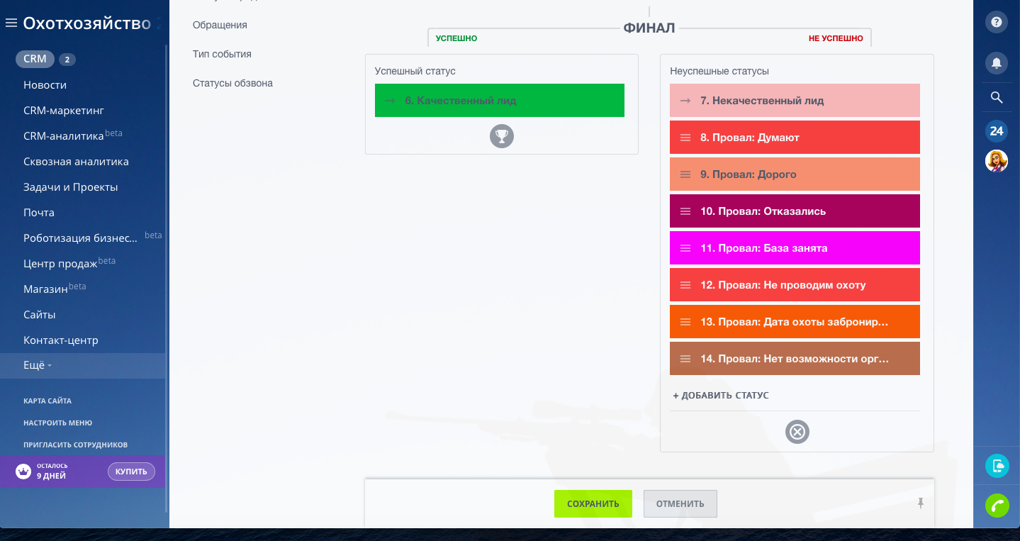 В Лидах и Сделках при переходе на стадию "Неуспешный Лид" и "Сделка Провалена" настроены причины провала Сделок и Лидов.Вся автоматизация работает на тарифах CRM+, Команда, Компания.