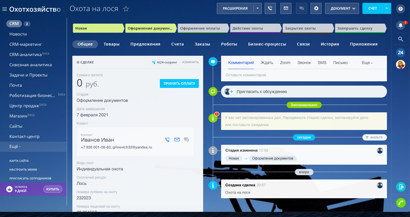 На четвертом этапе "Заезд" автоматически создается договор на проживание, заполняем все данные гостей. На этом этапе сделка автоматически копируется в направление "Услуги на охоту путёвки/лицензии". Сделка автоматически переходит на следующую стадию в день выезда гостей.