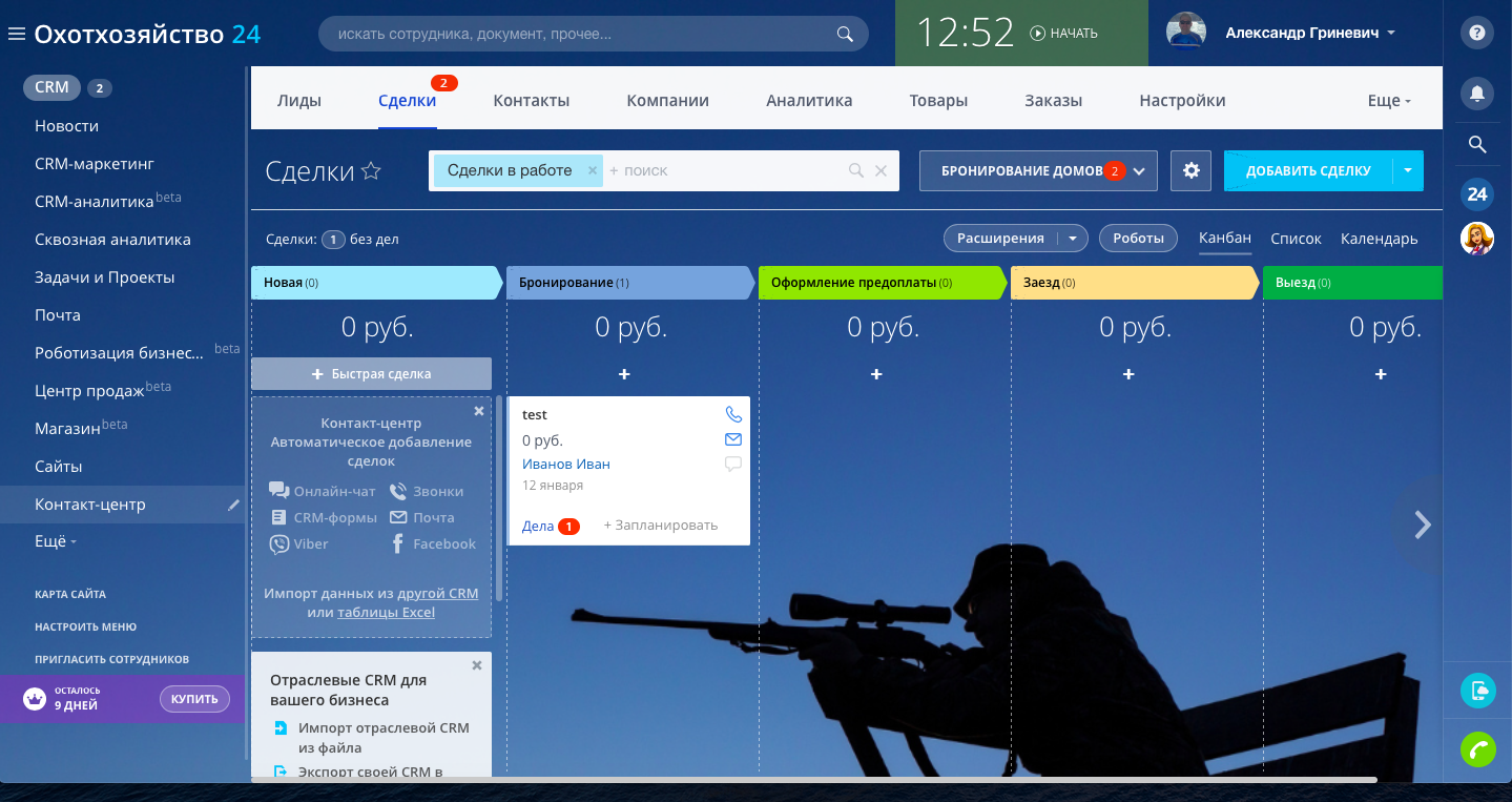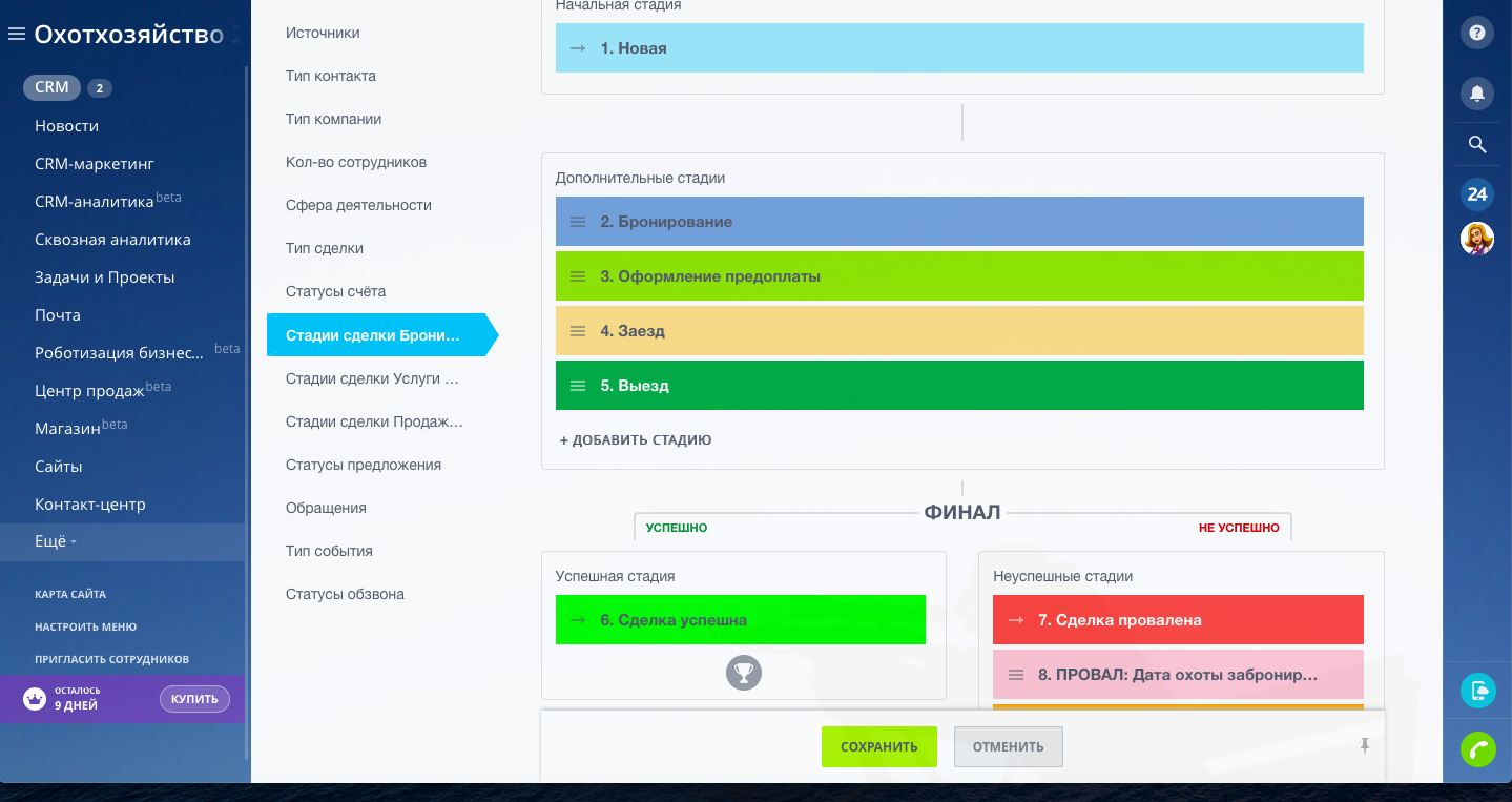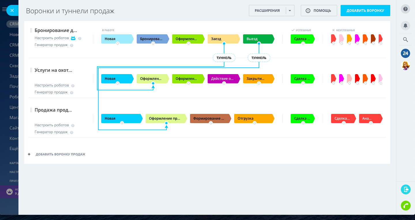 Настроены туннели продаж. Основным направлением является "Бронирование домов", клиент бронирует проживание на даты проведения охоты. В направлении "Бронирование домов" на стадии "Заезд" сделка копируется в направление "Услуги на охоту путёвки/лицензии", и в данном направлении оформляются все услуги на охоту по данной сделке. Далее на стадии сделки "Выезд" сделка копируется в направление "Продажа продуктов", в данном направлении оформляются все услуги по ресторану, бару и любая продажа сувениров и продуктов питания.
