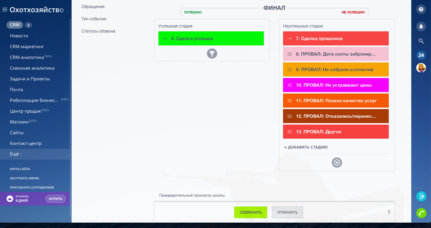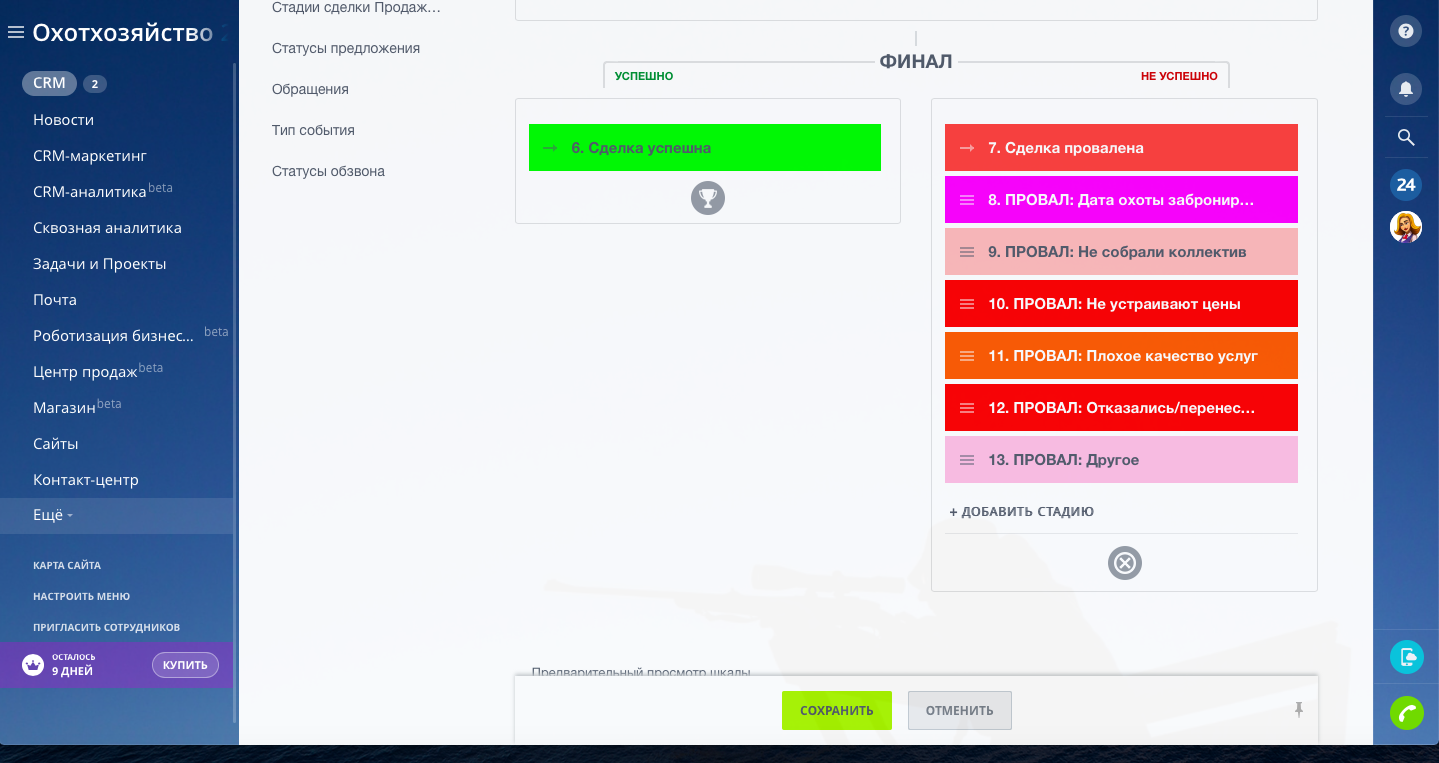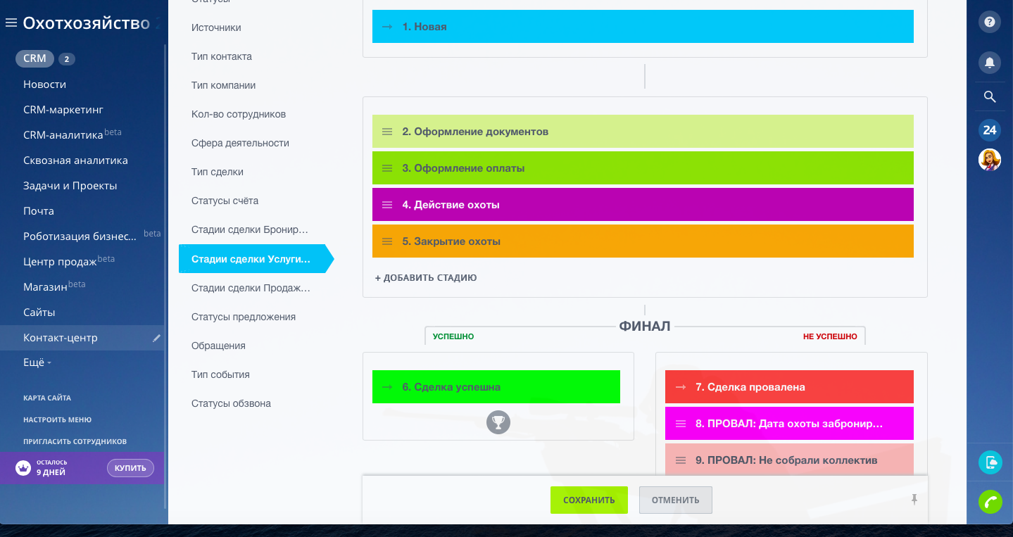 Настроены туннели продаж. Основным направлением является "Бронирование домов", клиент бронирует проживание на даты проведения охоты. В направлении "Бронирование домов" на стадии "Заезд" сделка копируется в направление "Услуги на охоту путёвки/лицензии", и в данном направлении оформляются все услуги на охоту по данной сделке. Далее на стадии сделки "Выезд" сделка копируется в направление "Продажа продуктов", в данном направлении оформляются все услуги по ресторану, бару и любая продажа сувениров и продуктов питания.