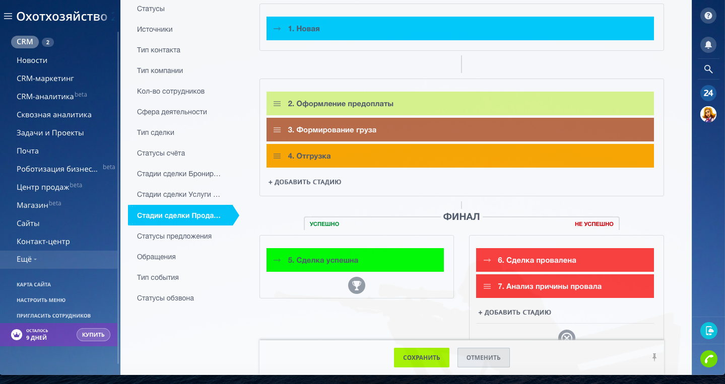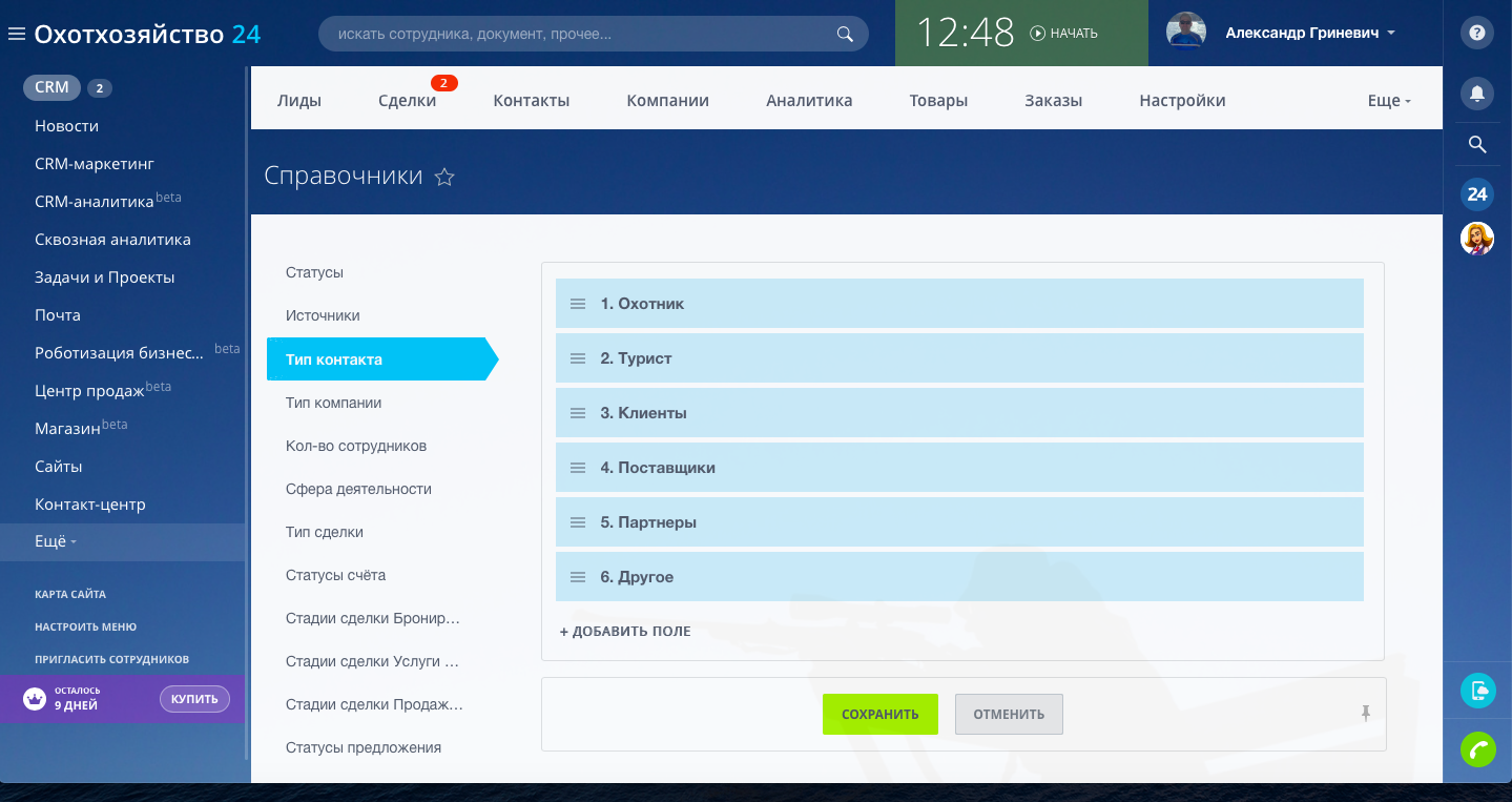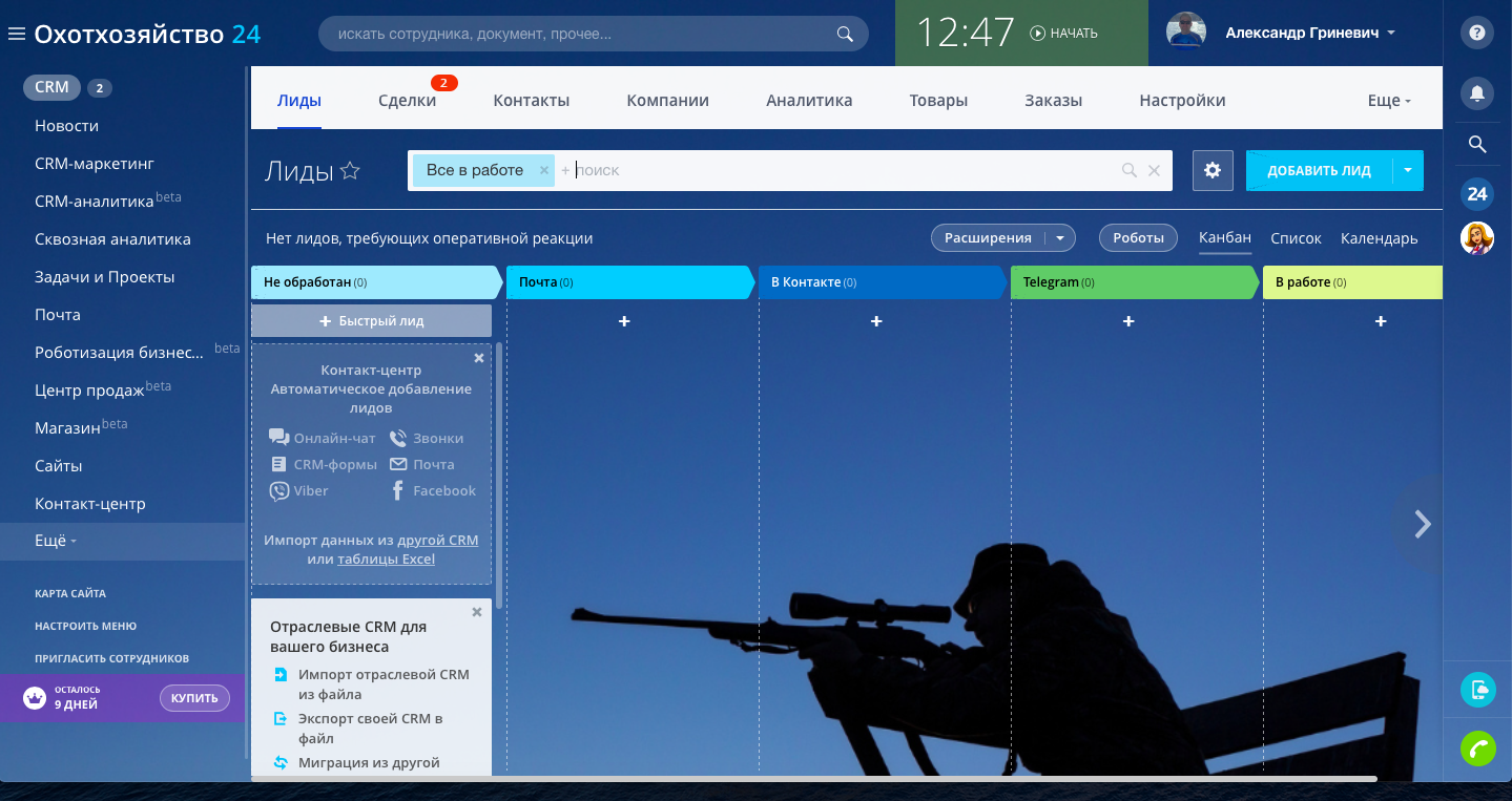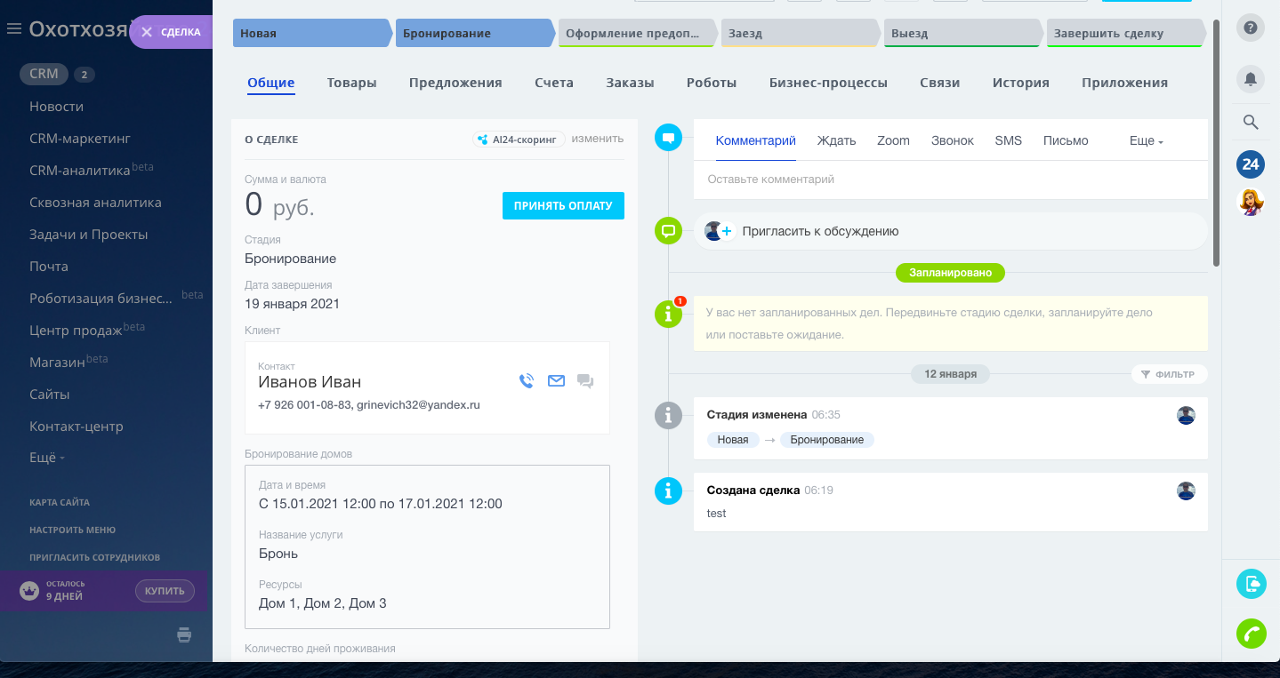 Настроены три направления сделок: "Бронирование домов", "Услуги на охоту путёвки/лицензии", "Продажа продуктов"