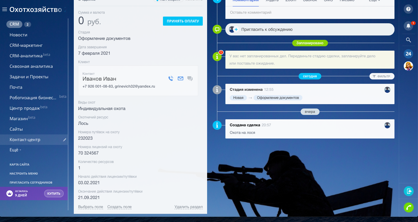 Отраслевая CRM Охотхозяйство, управление Охотхозяйством, учёт путёвок и лицензий на охоту. Бронирование домов.
