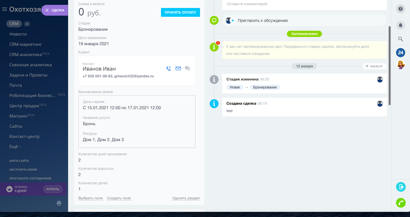 В направлении сделок "Бронирование домов" добавлены поля бронирования домов с добавлением даты, времени и названия дома. Добавлен учёт количества проживаемых взрослых и детей.