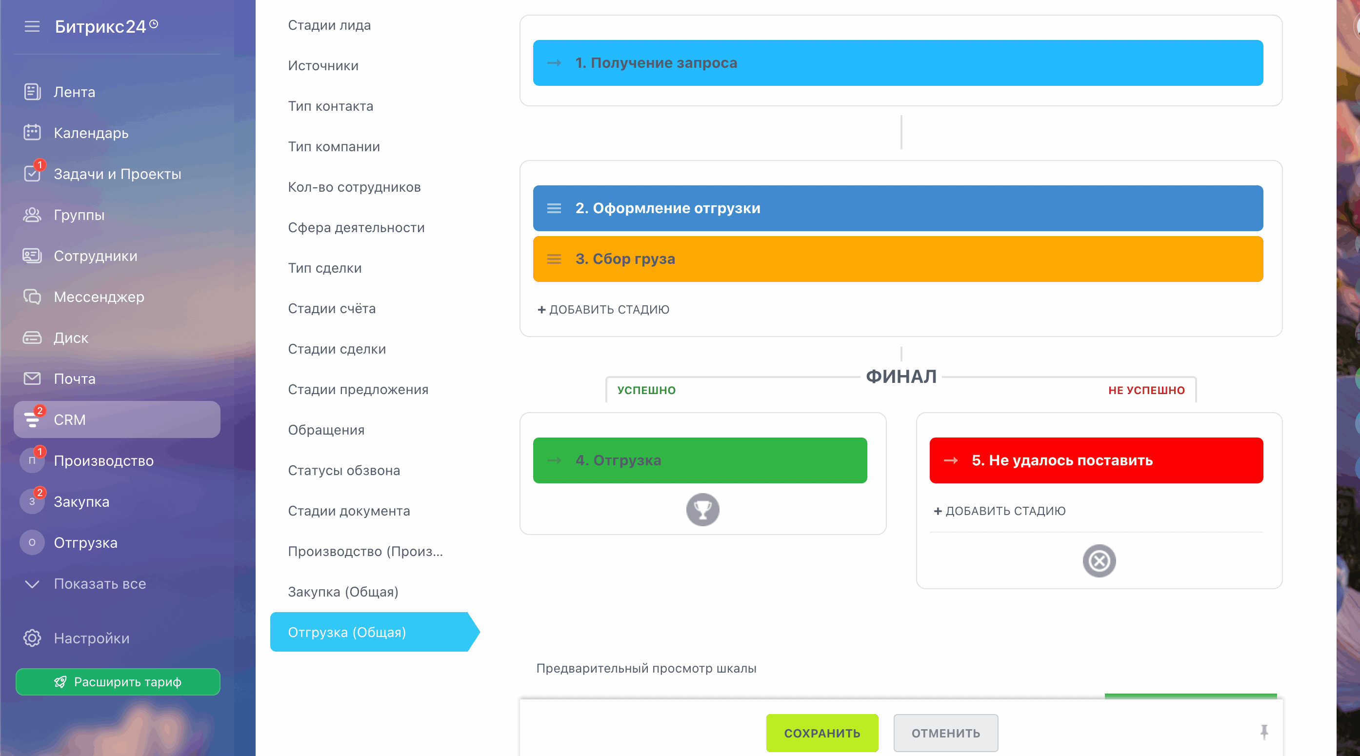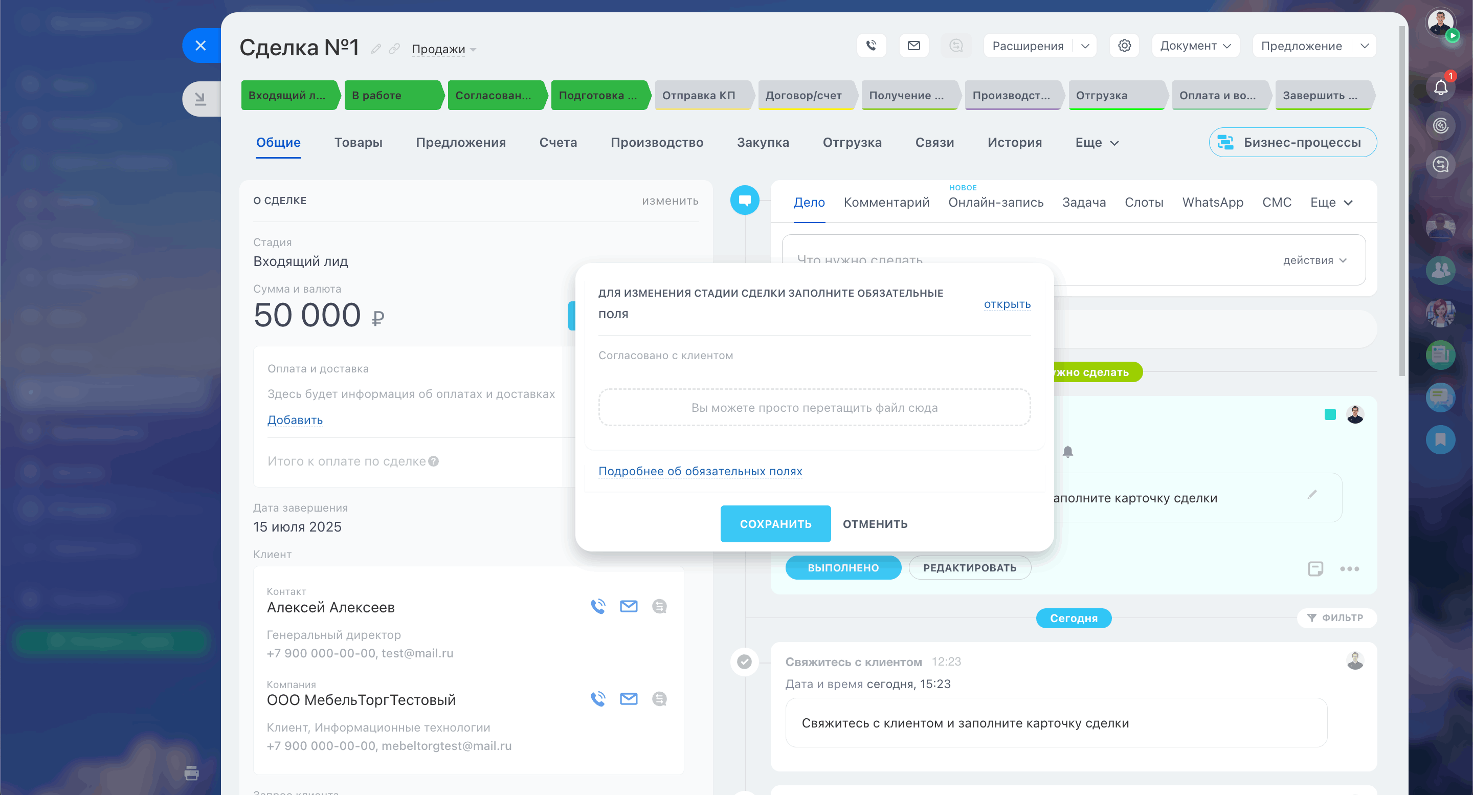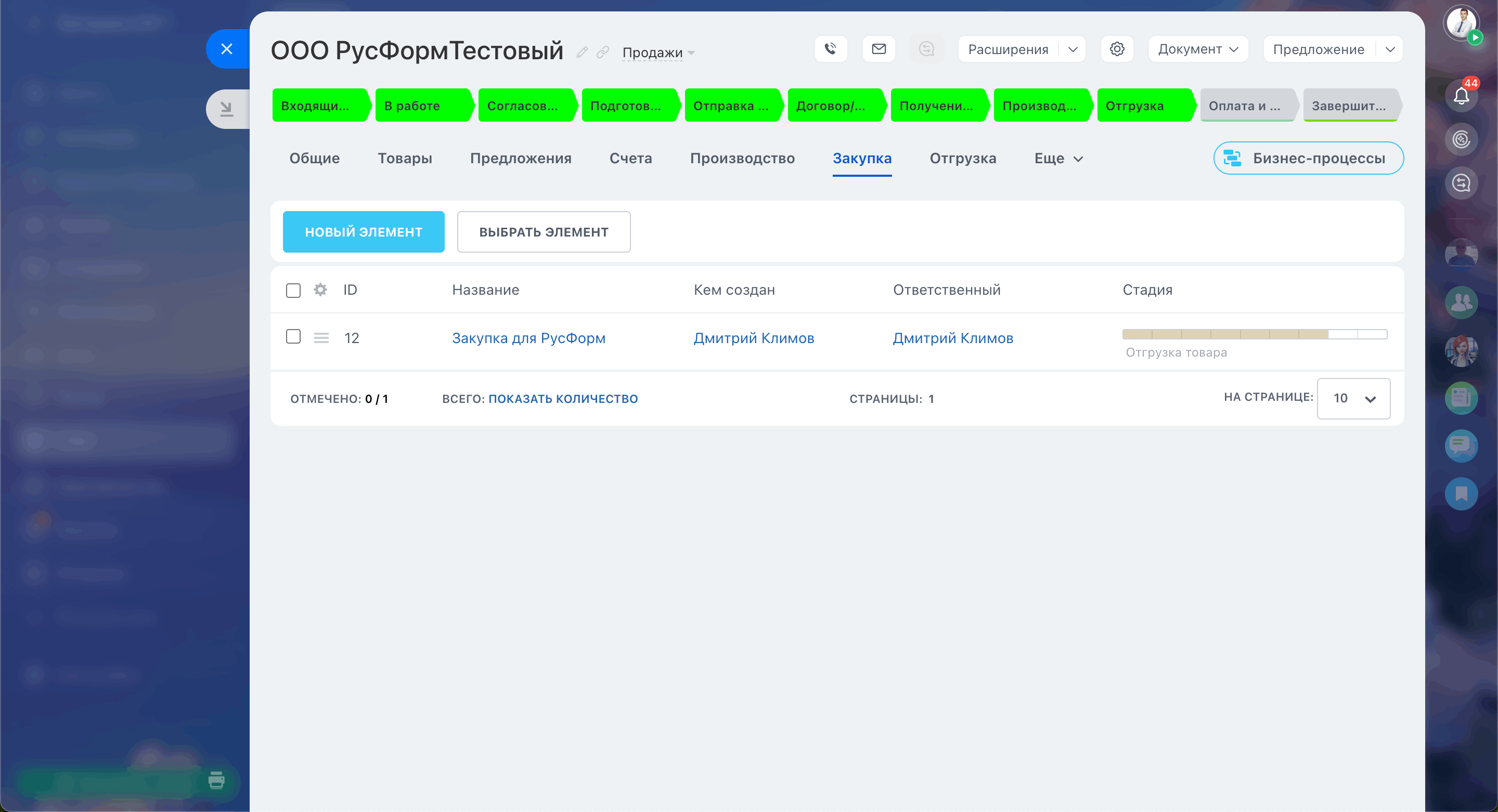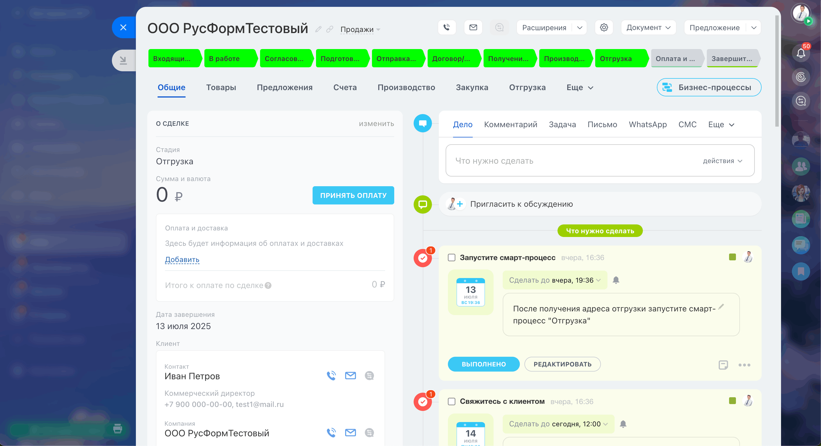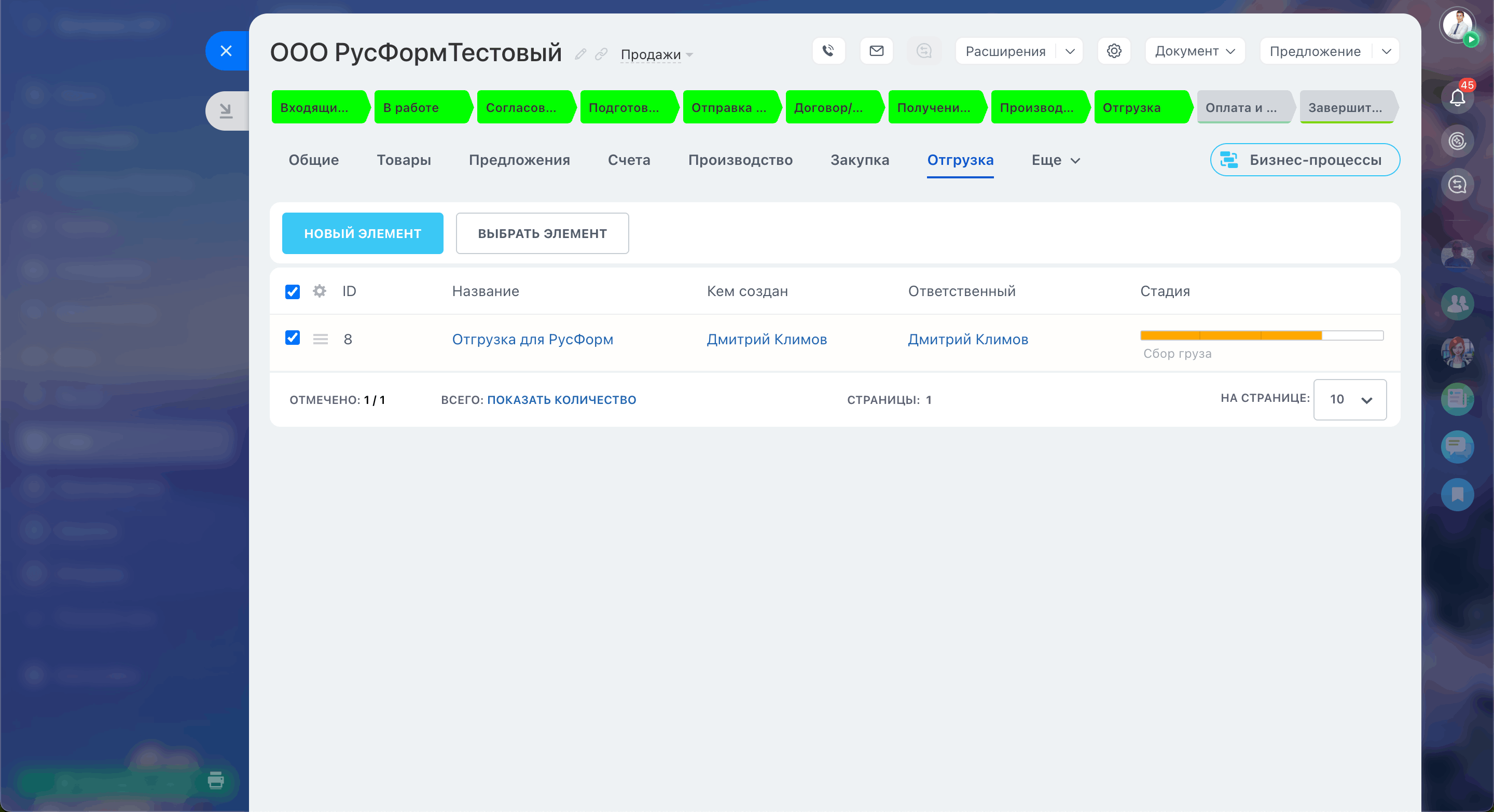 - После завершения этапа, стадия сделки в воронке Продаж автоматически обновляется до «Отгрузка».