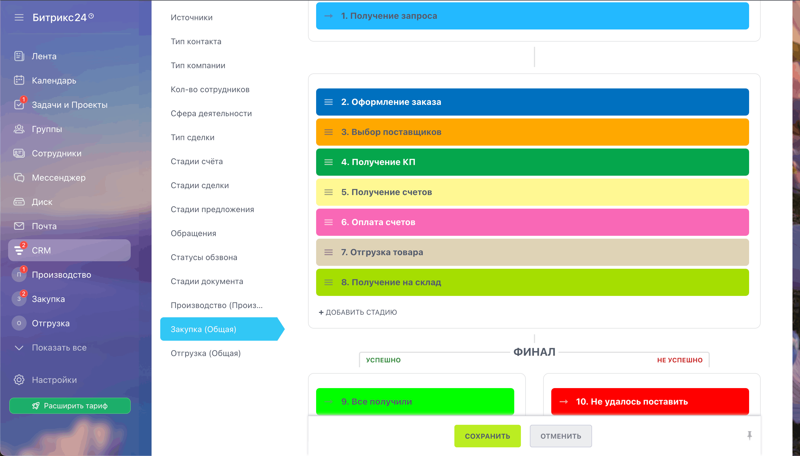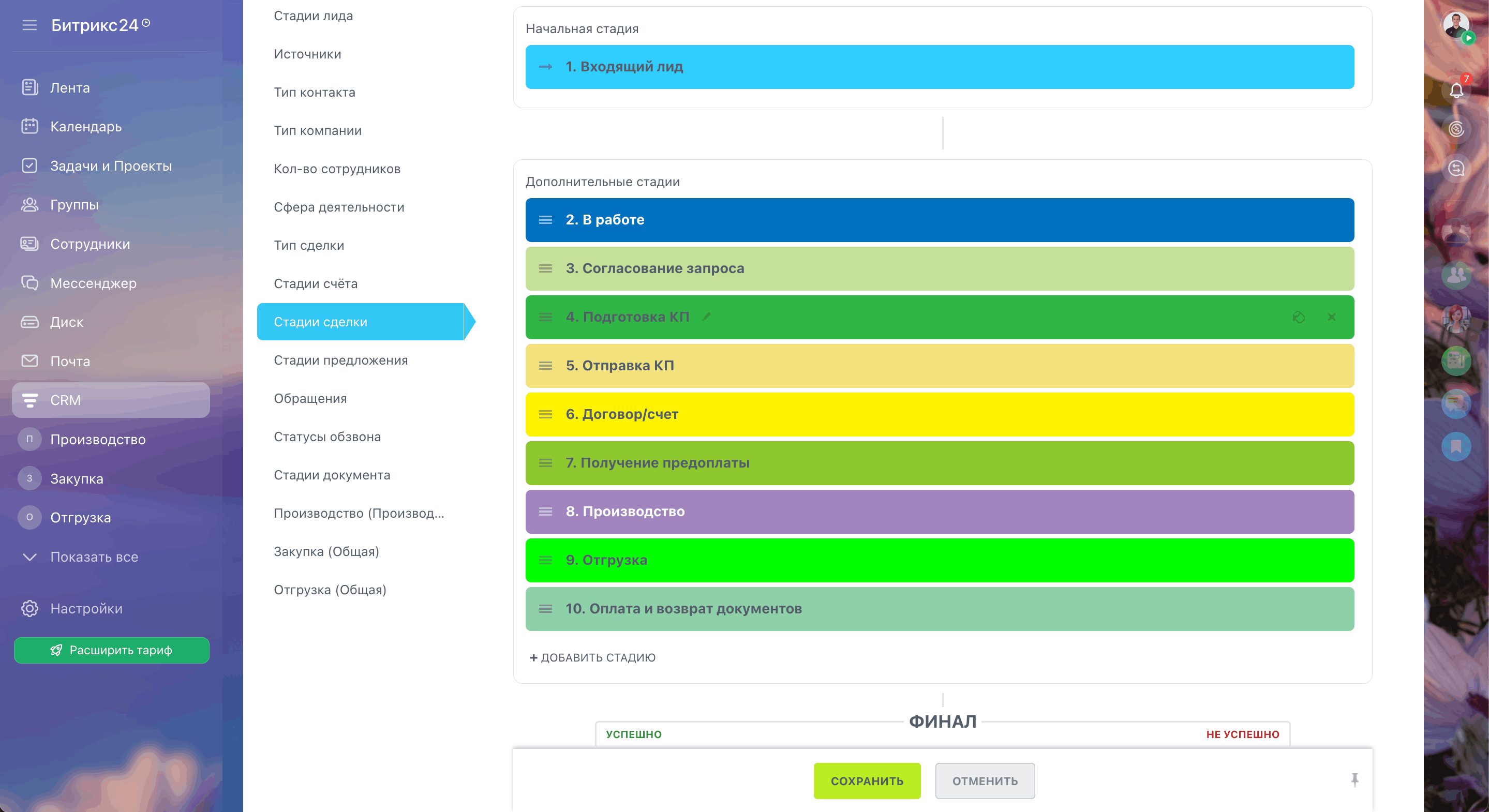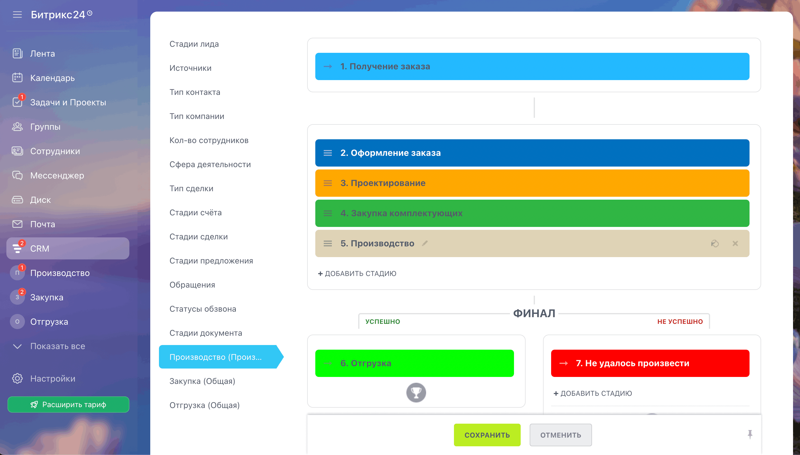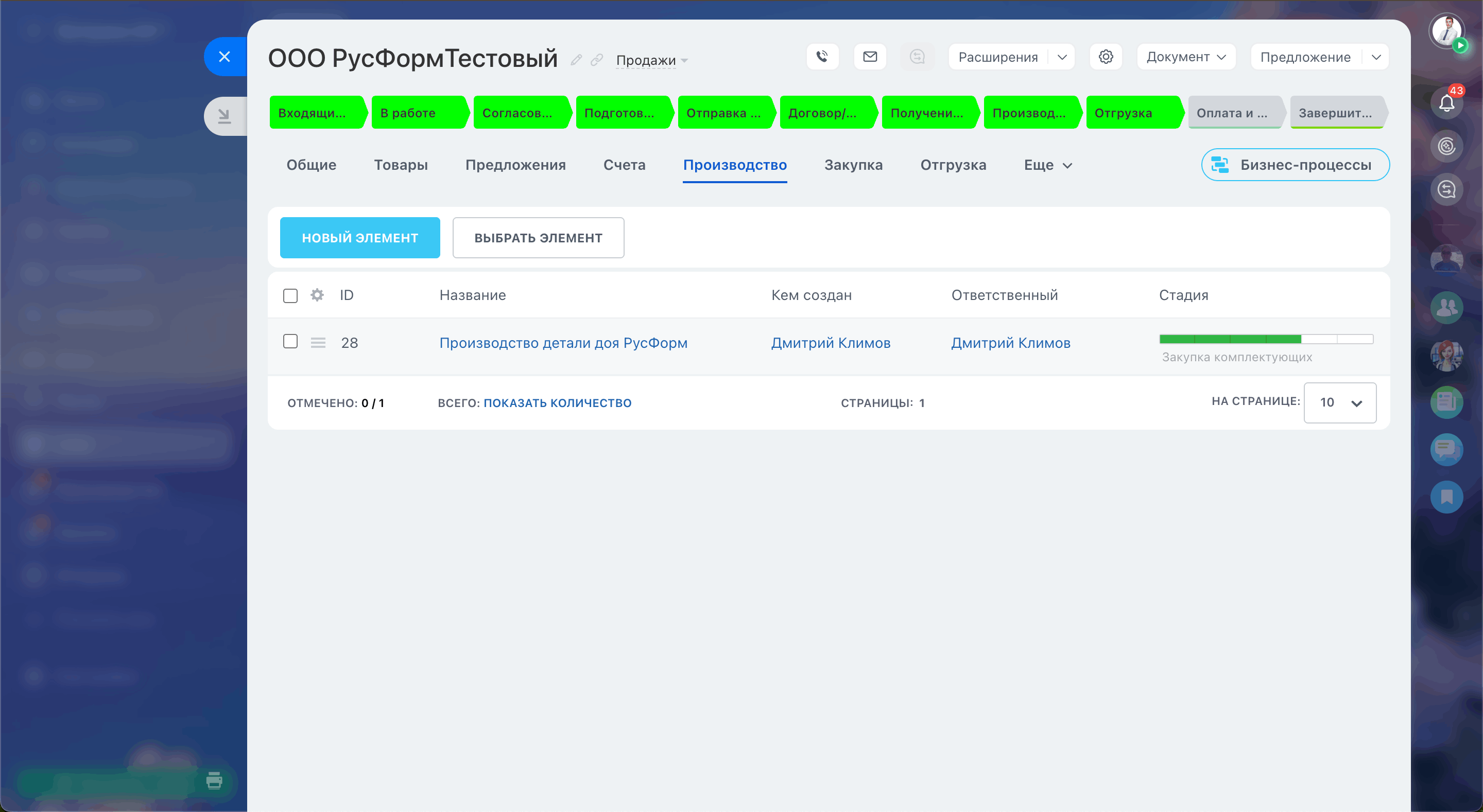 Для организации работы по этапам реализации сделки настроены три смарт-процесса* (Производство, Закупка и Отгрузка), которые подключаются и настраиваются нашими специалистами после установки CRM. На скриншотах можно увидеть, как будут выглядеть готовые воронки и этапы. Они тесно взаимодействуют с основной воронкой Продаж: