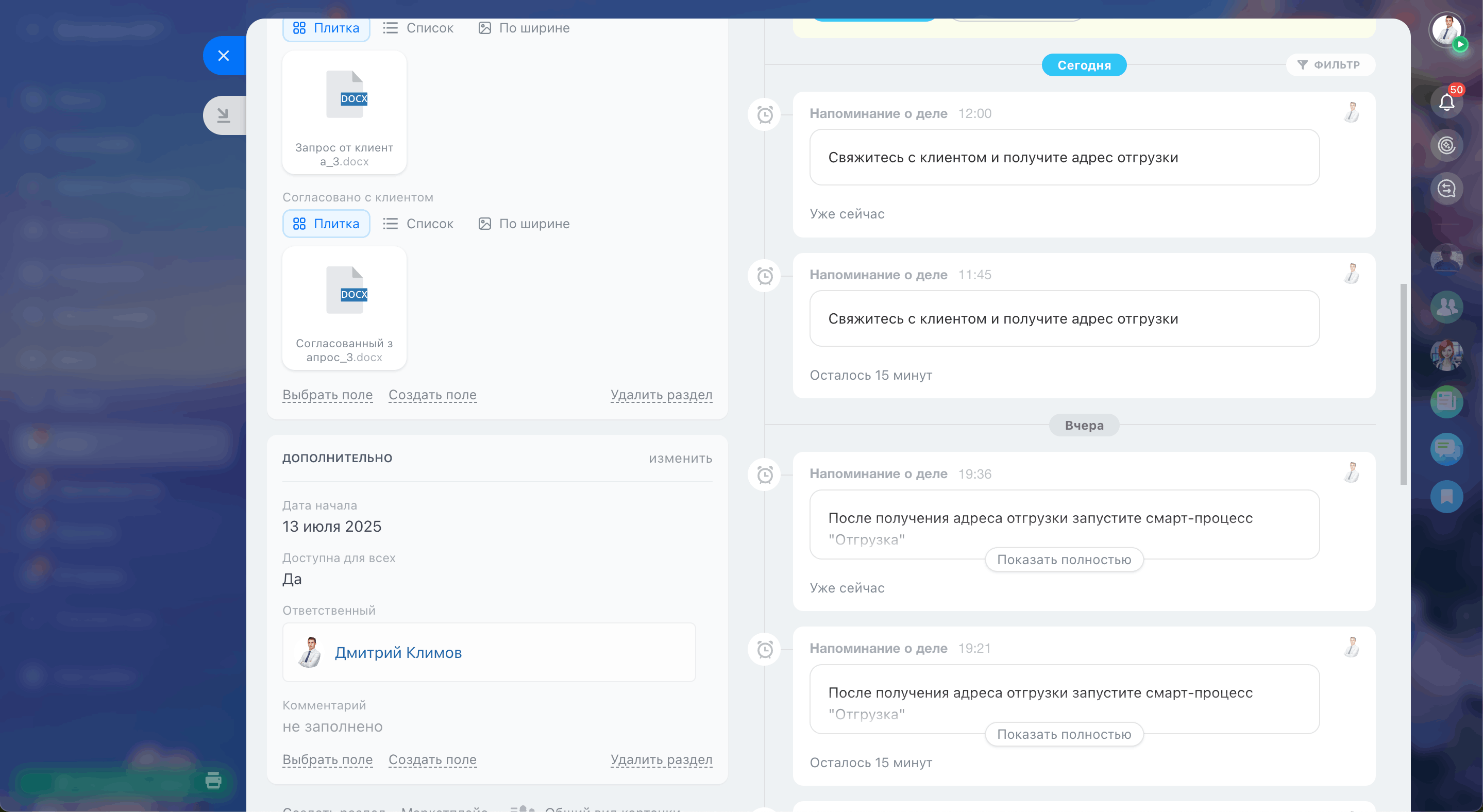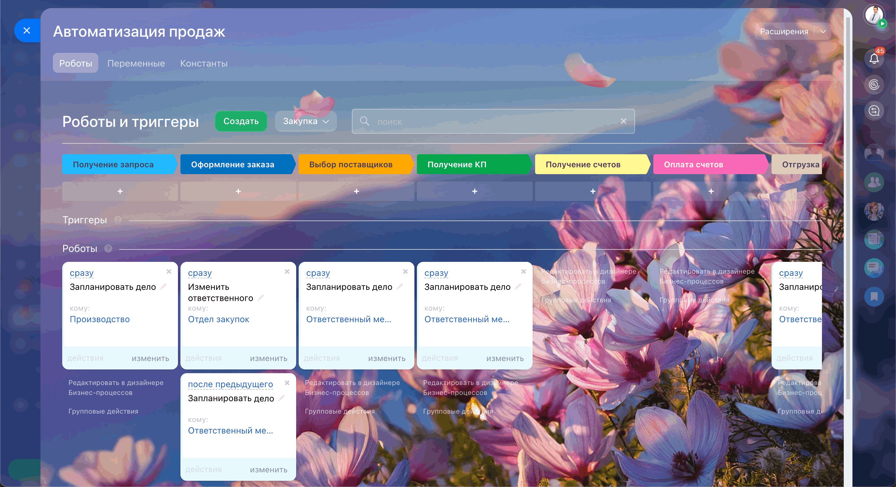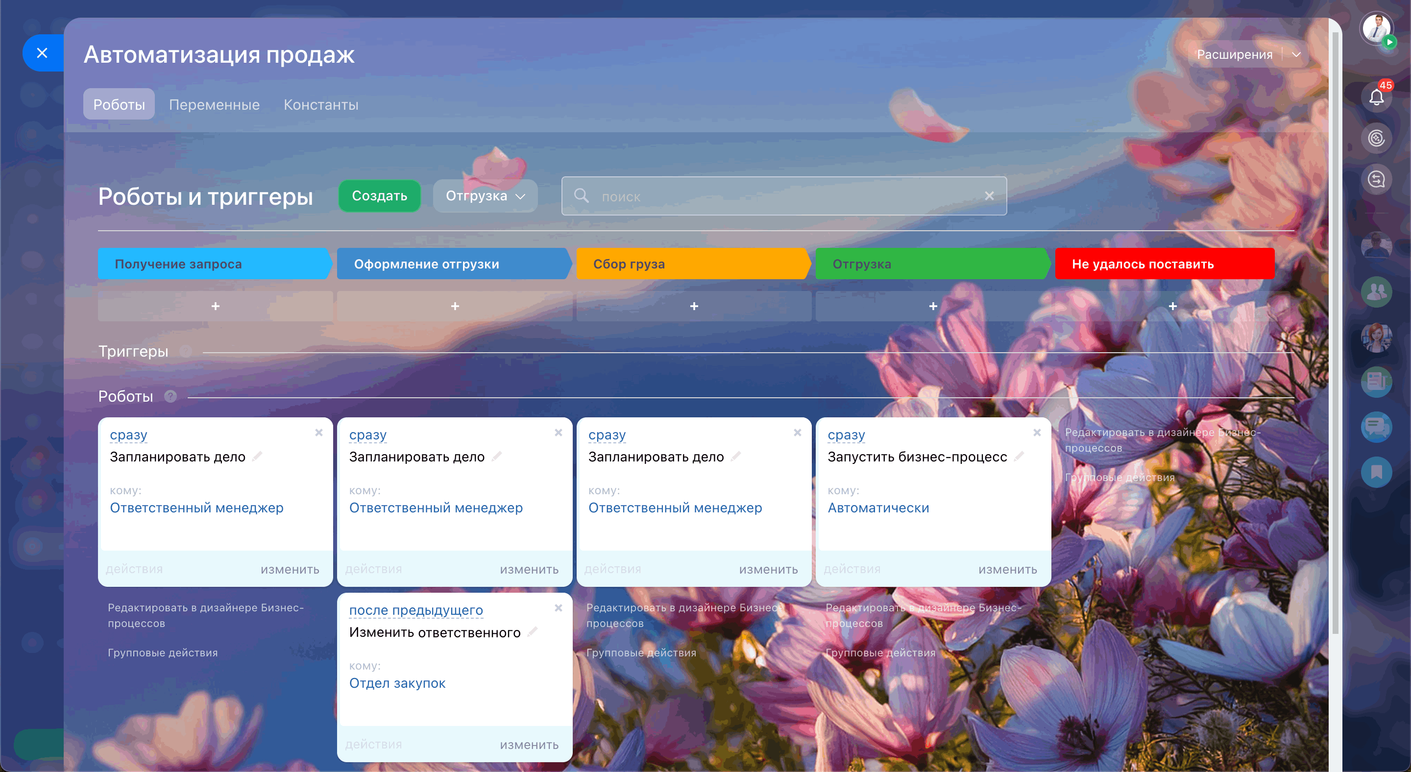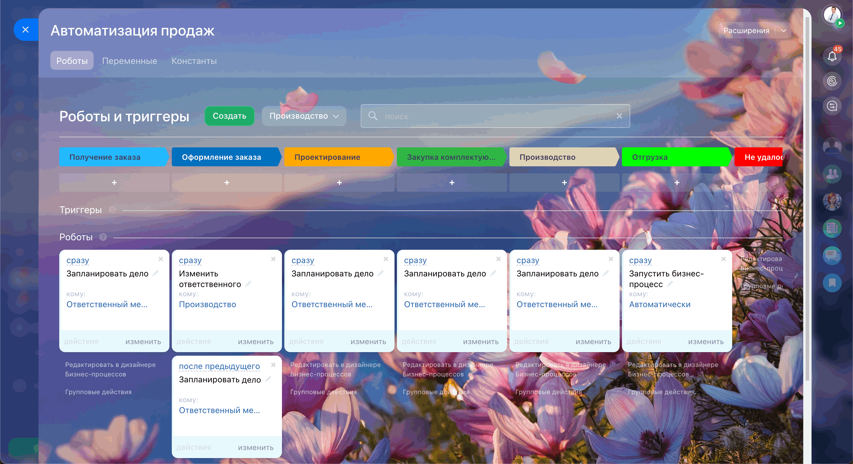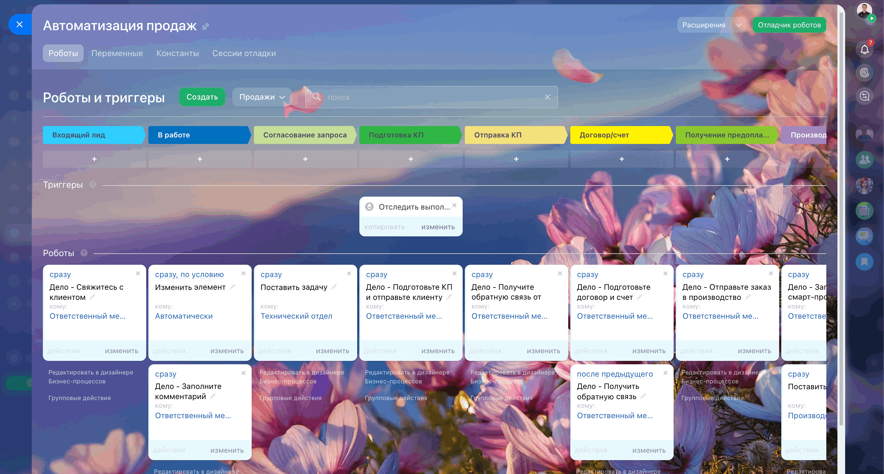 - Настроены роботы и триггеры, которые автоматически создают задачи и дела для сотрудников с четкими указаниями.