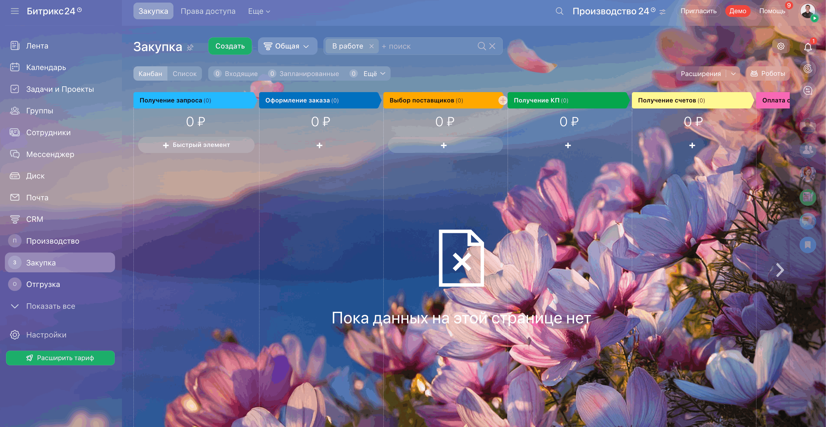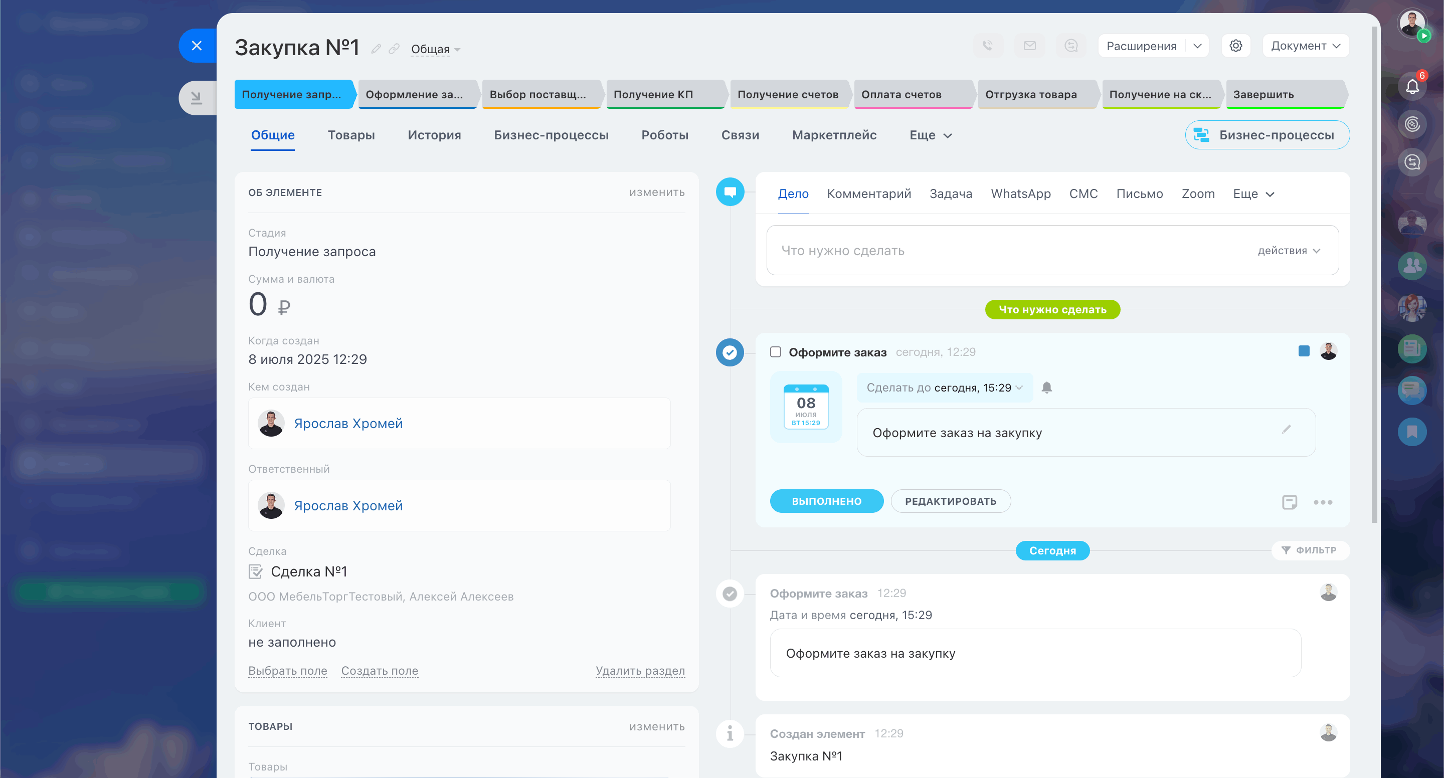 - Настроены автоматические уведомления и задачи для контроля сроков и качества закупки.