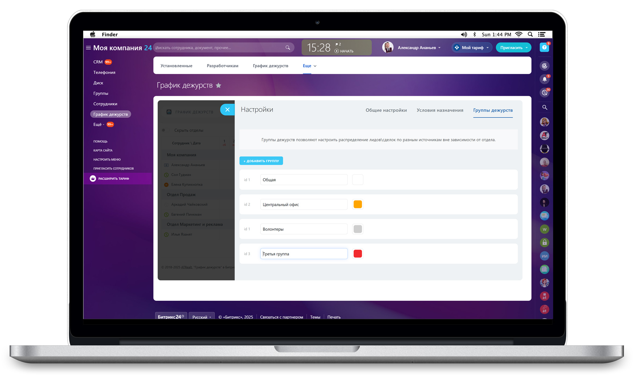 Если в вашей компании сотрудники из одного или нескольких отделов могут быть дежурным по заявкам по разным источникам - добавьте в график отдельную группу.