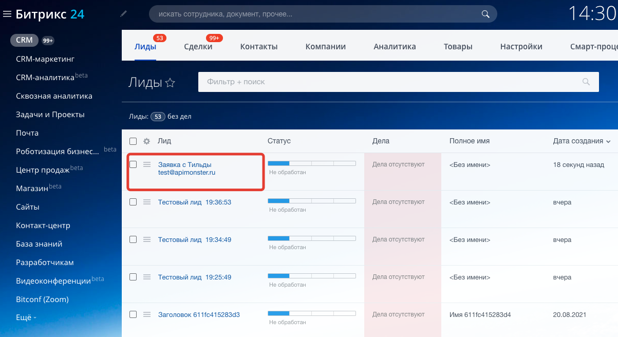 - создание задач на менеджера, например, обработать новый лид.