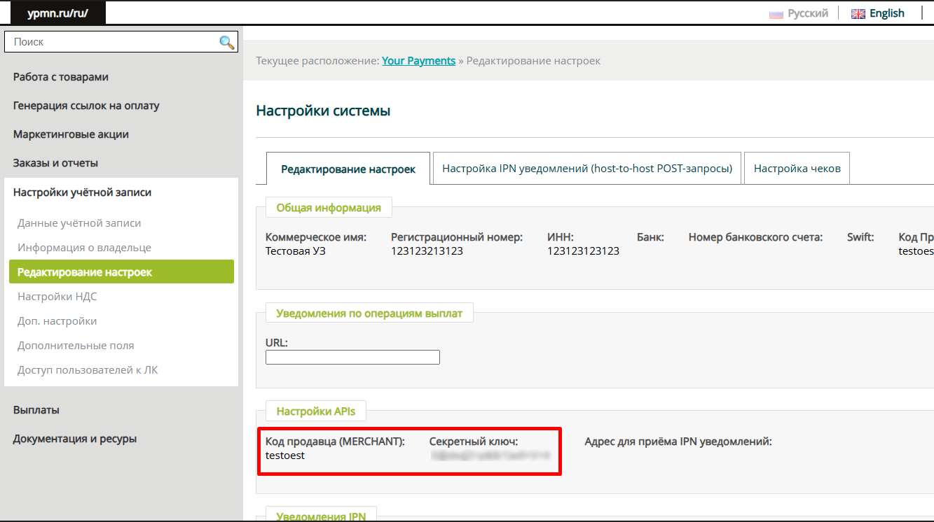 Поддержка тестового режима и проведения тестовых платежей