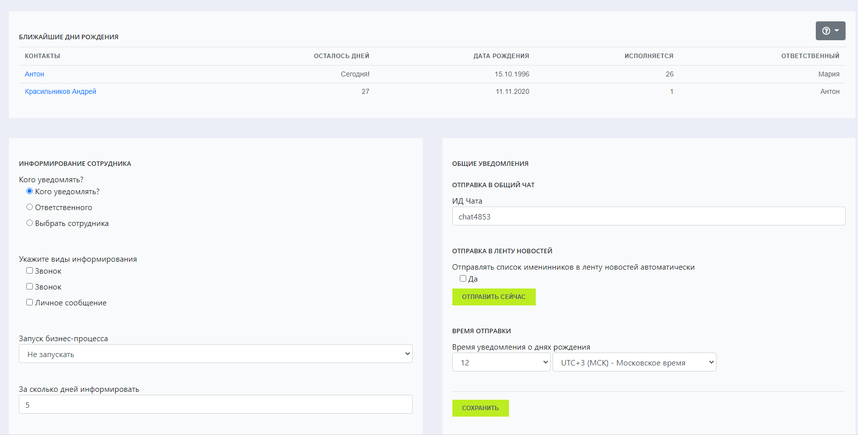 Общие уведомления могут отправляться в день рождения клиента двумя способами: в ленту новостей портала Битрикс24 и в чат группы.