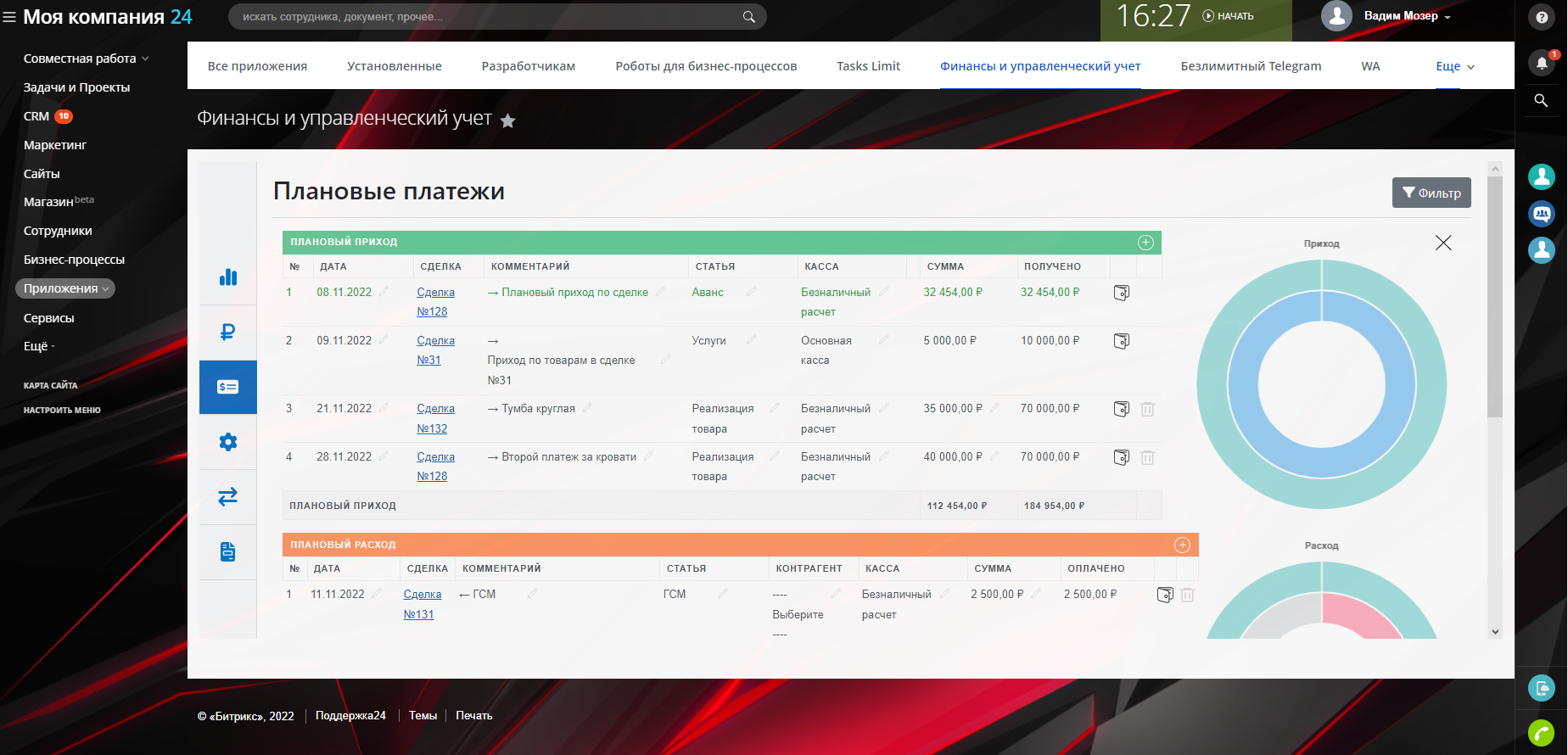 Приложение позволяет контролировать доходы и расходы внутри сделок, компании в целом и выводить информацию для управленческих отчетов.