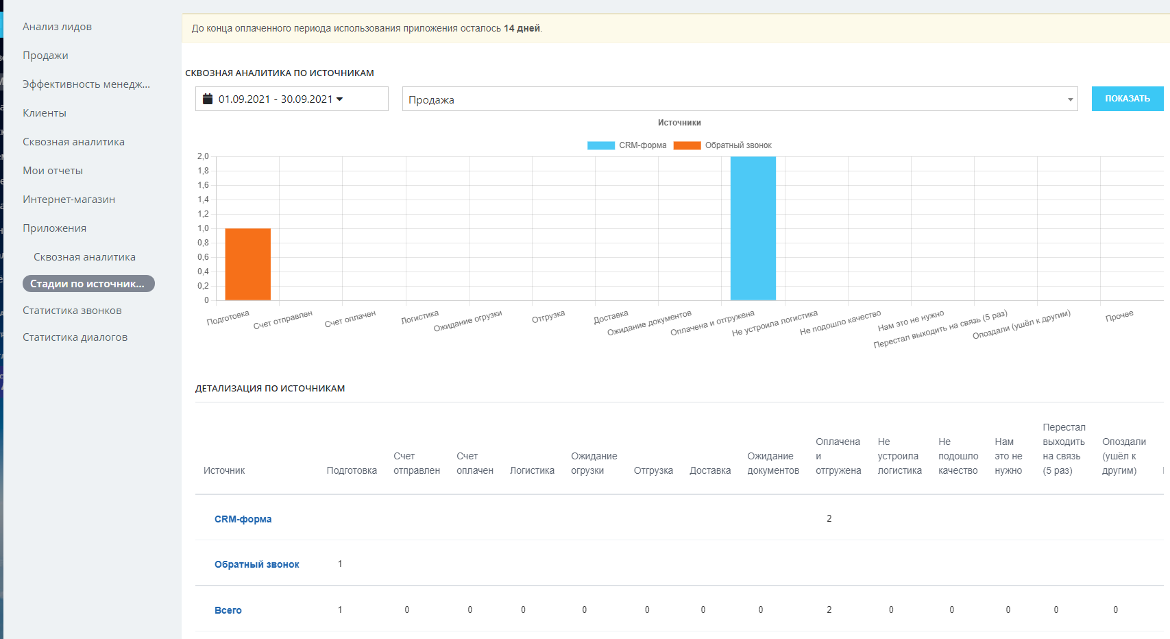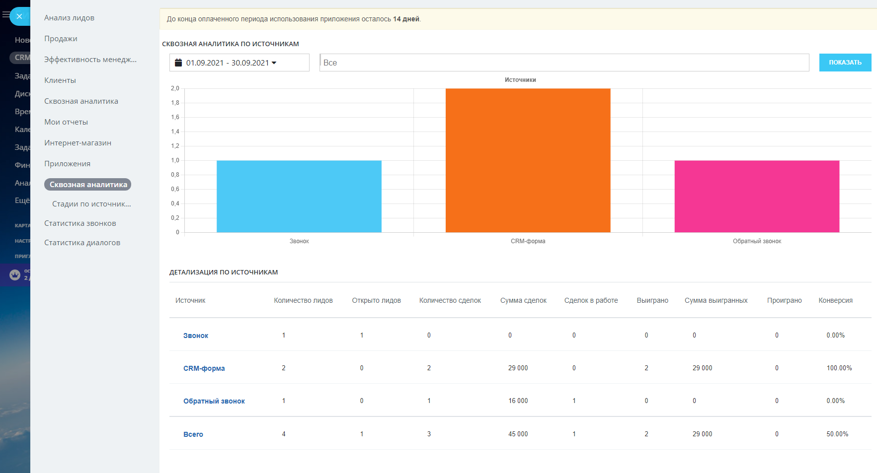 Отчет показывает конверсию от лида до конвертацию в успешную сделку. Анализируйте эффективность источников.