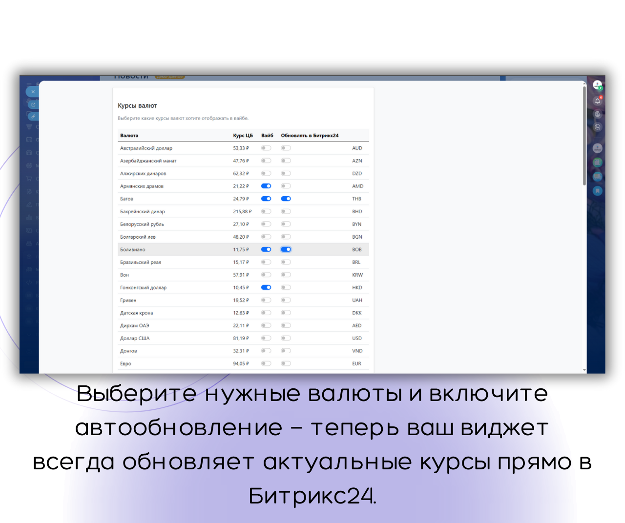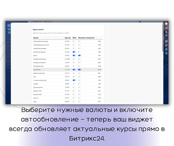 Вы также можете выбрать, какие именно валюты отслеживать, чтобы виджет отображал только то, что действительно важно для вашего бизнеса.
