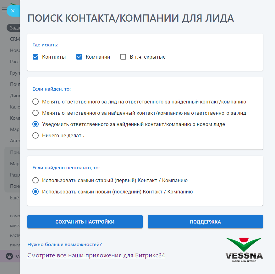 2. Выбрать, что следует делать после обнаружении Контакта/Компании и указания ее в карточке Лида – можно: