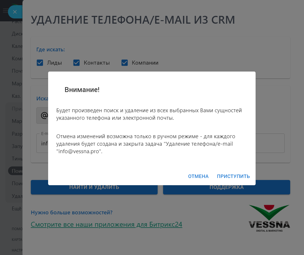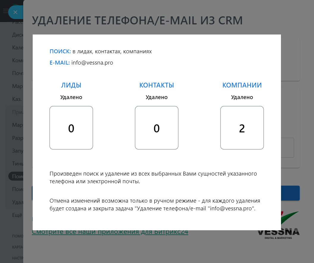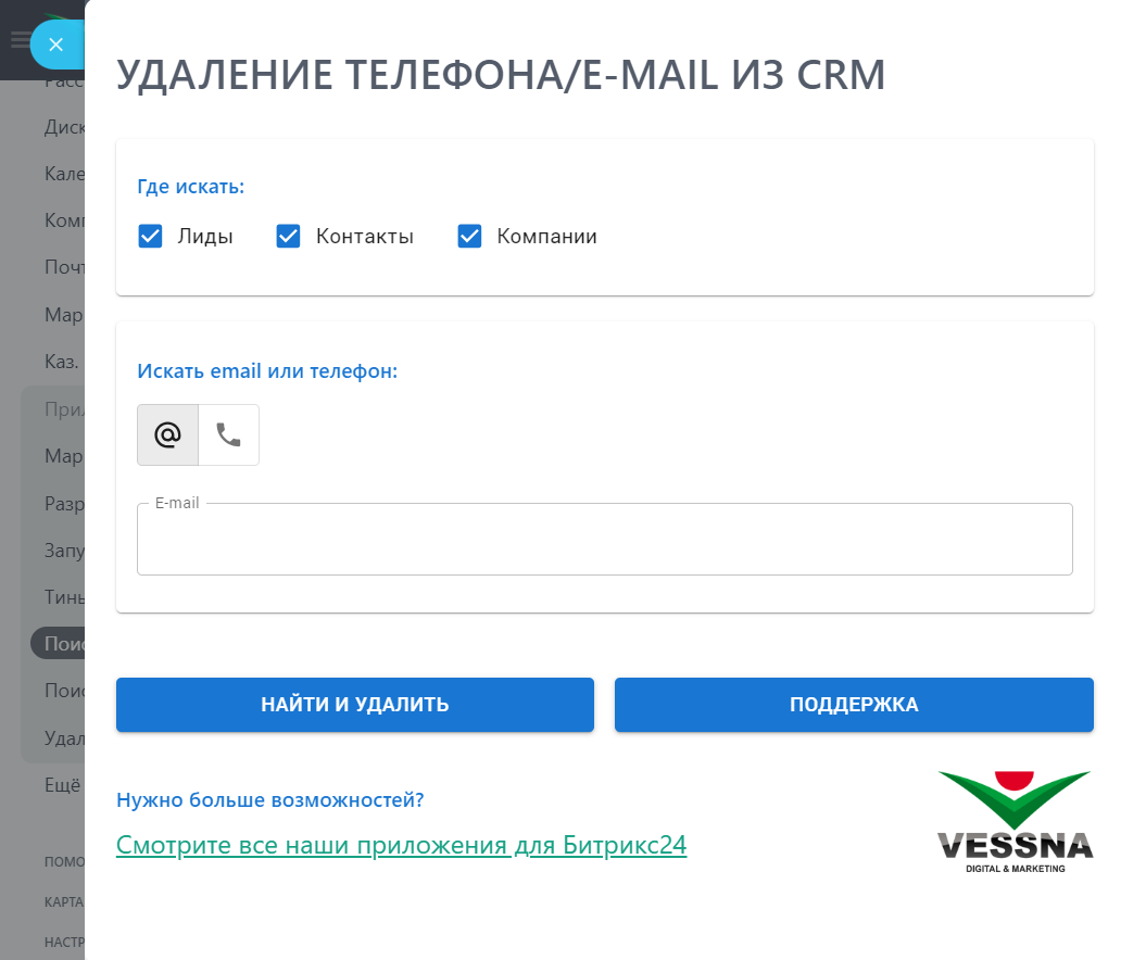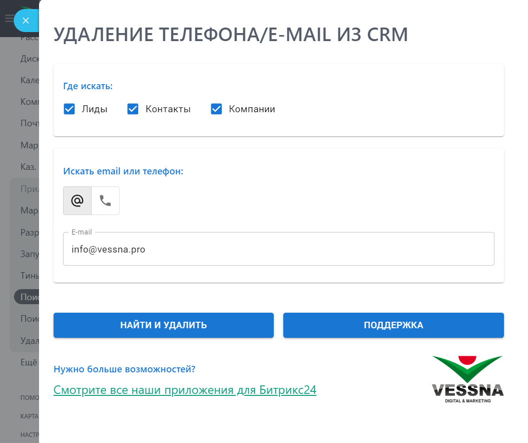 Приложение ищет и удаляет во всех Лидах, Контактах и Компаниях (в зависимости от Вашего выбора) в CRM конкретный номер телефона или адрес электронной почты.