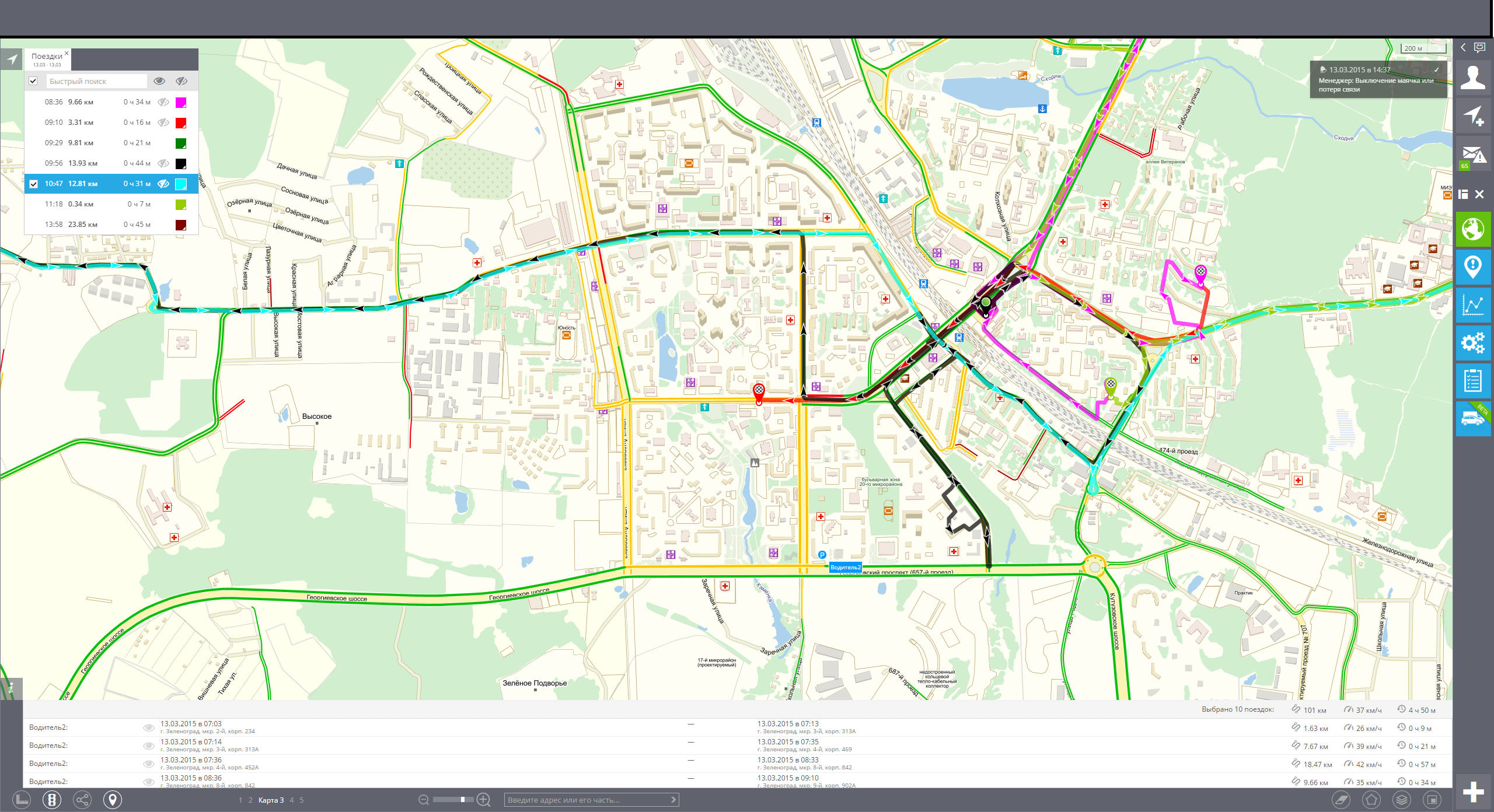 - Отображение даты, времени, адреса начала и окончания движения, «следа» перемещений объектов, длины и продолжительности пройденного пути, направления, скорости.