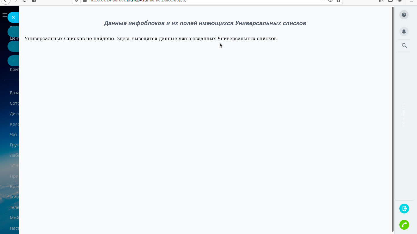 Если Списки в Вашем Битрикс24 еще не созданы, то Приложение это подтвердит текстом "Универсальных Списков не найдено. Здесь выводятся данные уже созданных Универсальных списков".