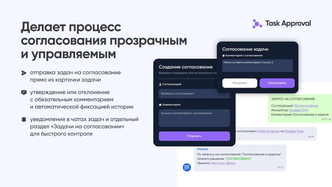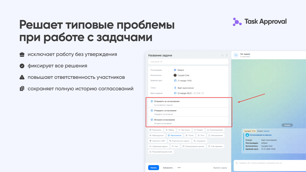 Task Approval решает эти вопросы, встраивая процесс согласования непосредственно в задачу и сохраняя всю историю решений в одном месте.