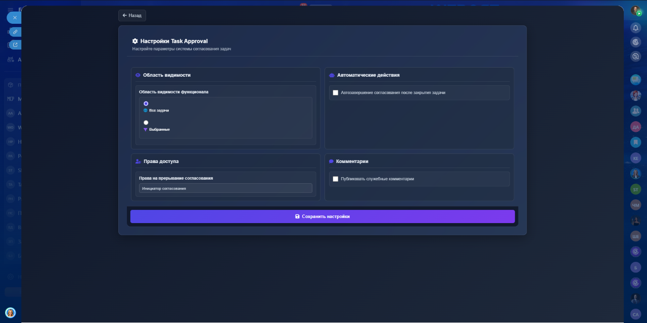 Шаг 3. Настройте правила согласования. Администратор может гибко управлять работой приложения: ограничивать использование согласований по проектам и группам, настраивать автоматическое завершение процесса и определять, кто имеет право его прерывать. Это позволяет адаптировать Task Approval под внутренние регламенты компании.