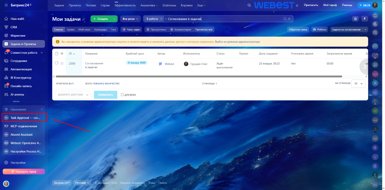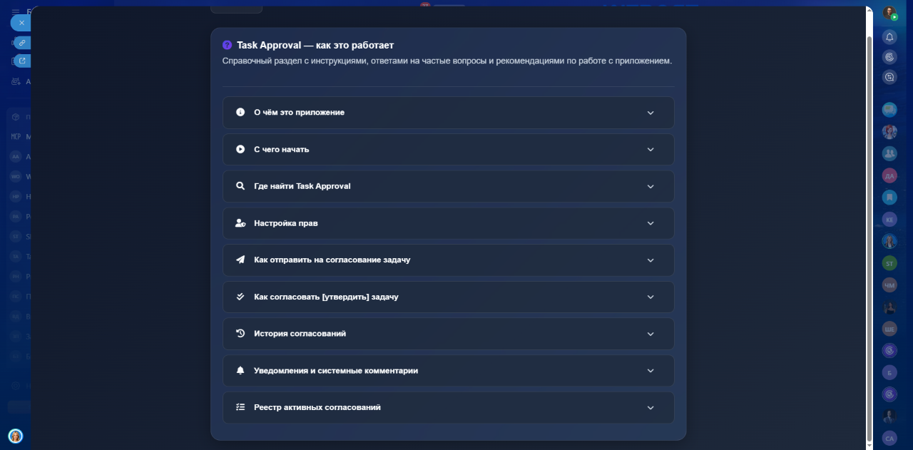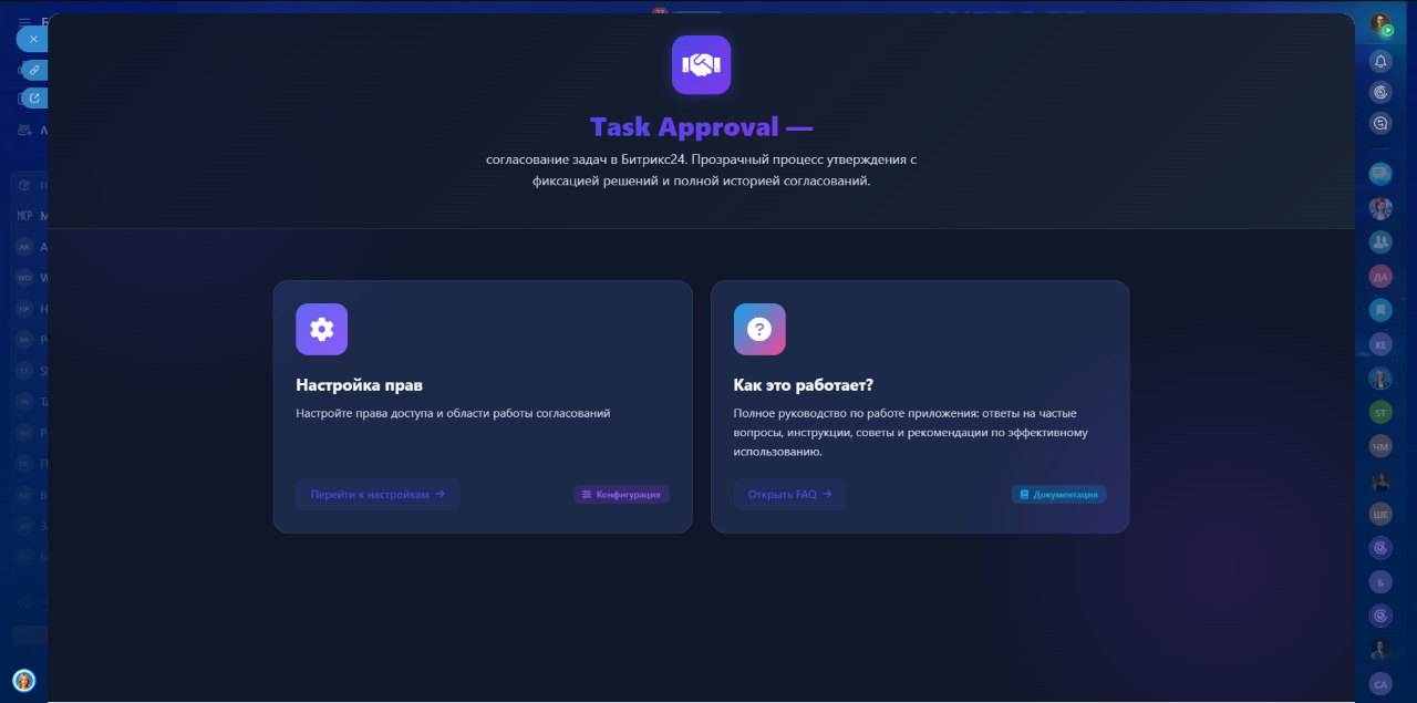Task Approval — это нативное расширение модуля «Задачи и проекты» Битрикс24 для управления процессом согласования задач в привычном интерфейсе.