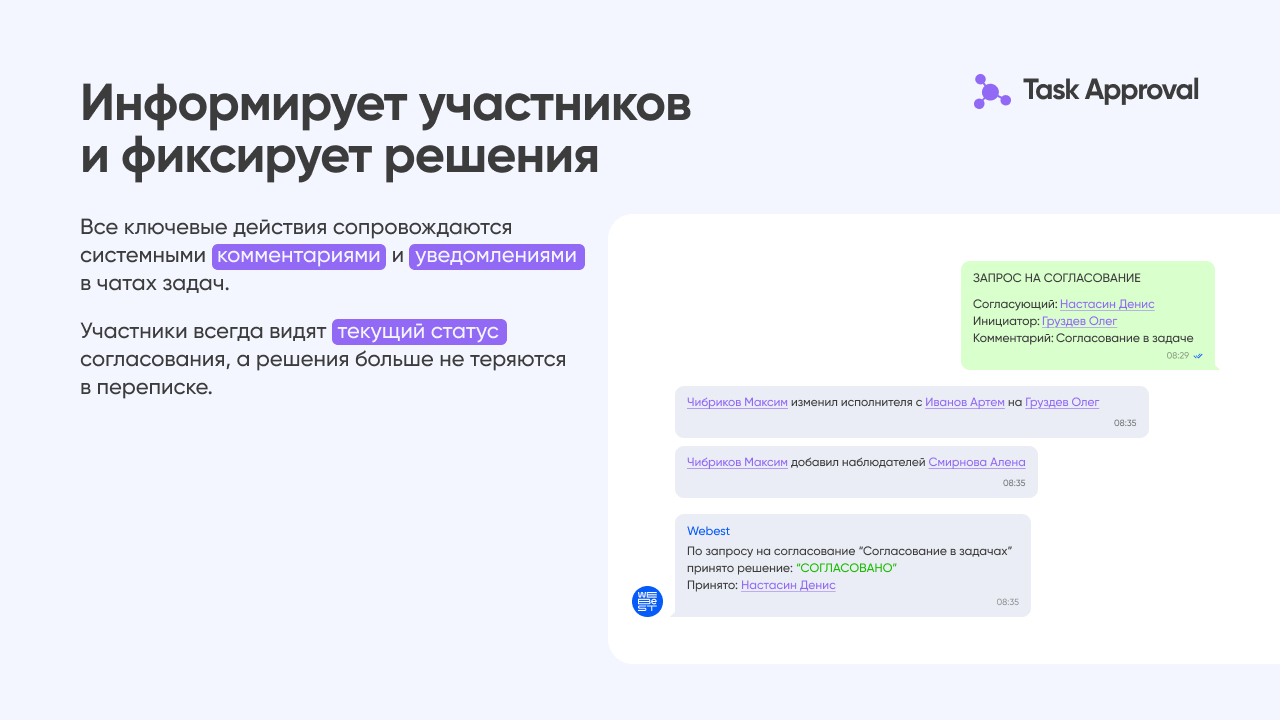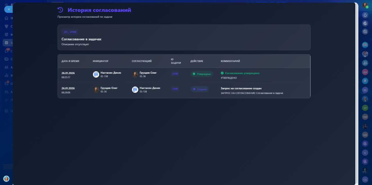 Приложение автоматически отправляет уведомления в чатах задач: при отправке задачи на согласование, при утверждении или отклонении. Все ключевые действия сопровождаются системными комментариями, чтобы не терялась история решений и участники всегда понимали текущий статус задачи.