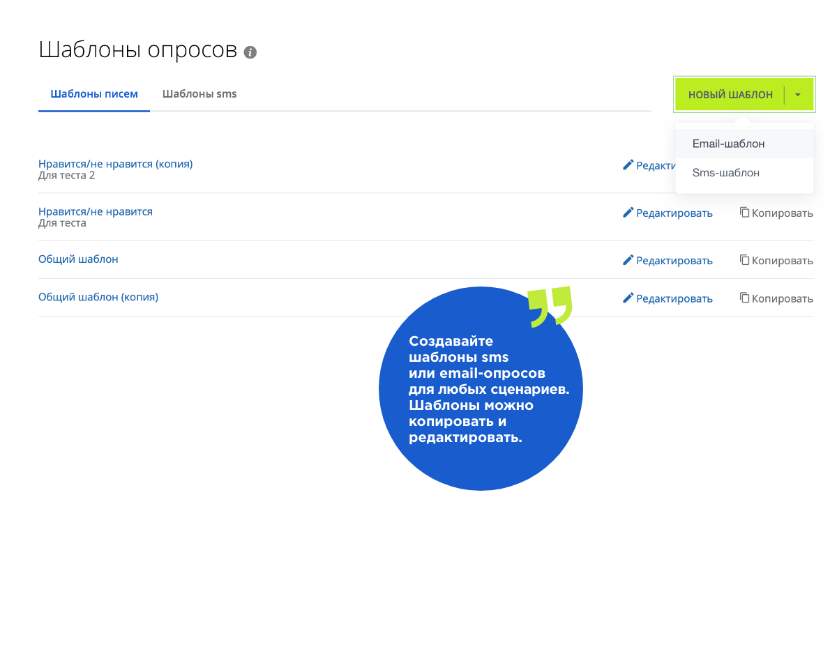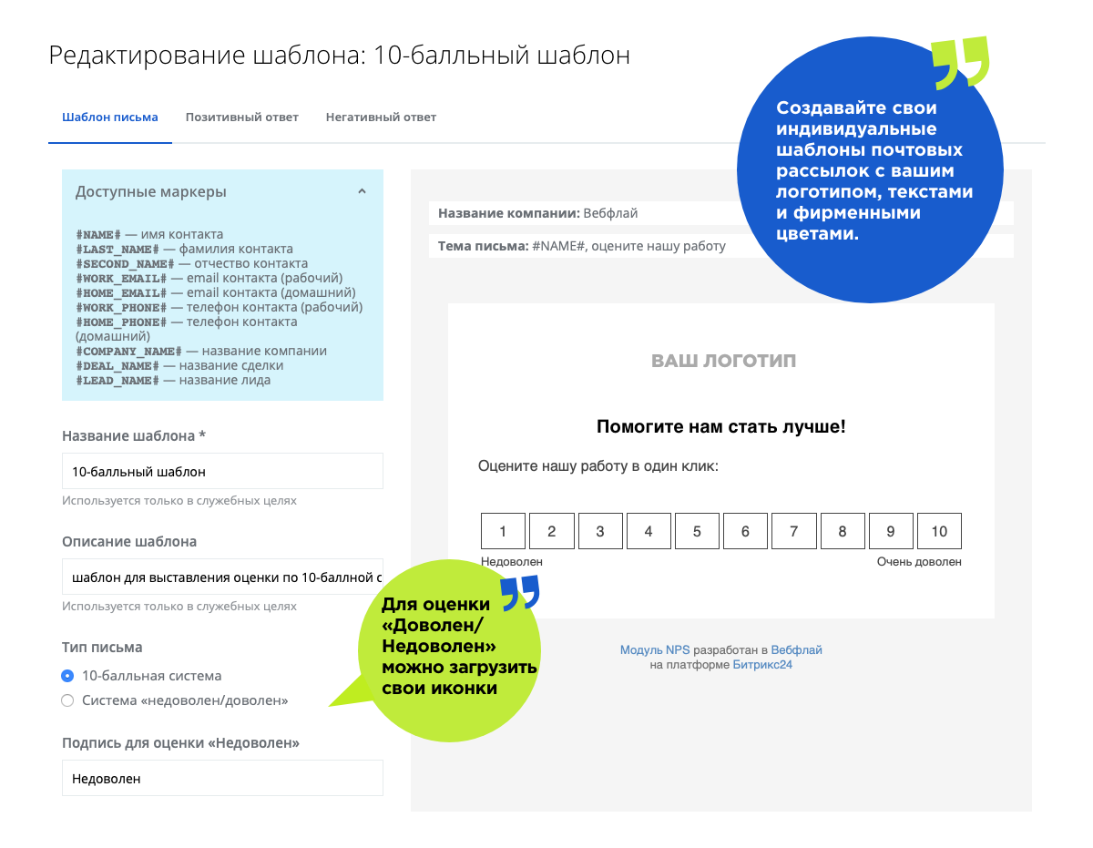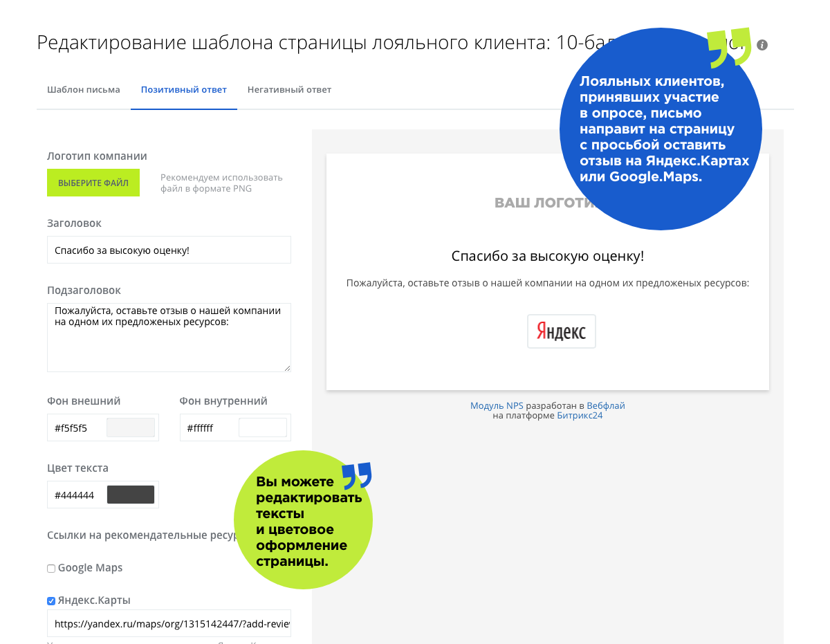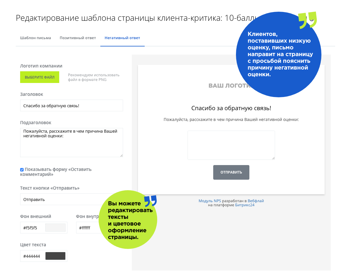 Для каждого направления деятельности и разных стадий вы можете создать любое количество шаблонов опросов, которые можно детально настраивать — менять фразы, цвета, логотипы компании (для разных видов бизнеса в рамках одного портала), действия при негативных оценках и ссылки на дублирование позитивной оценки.