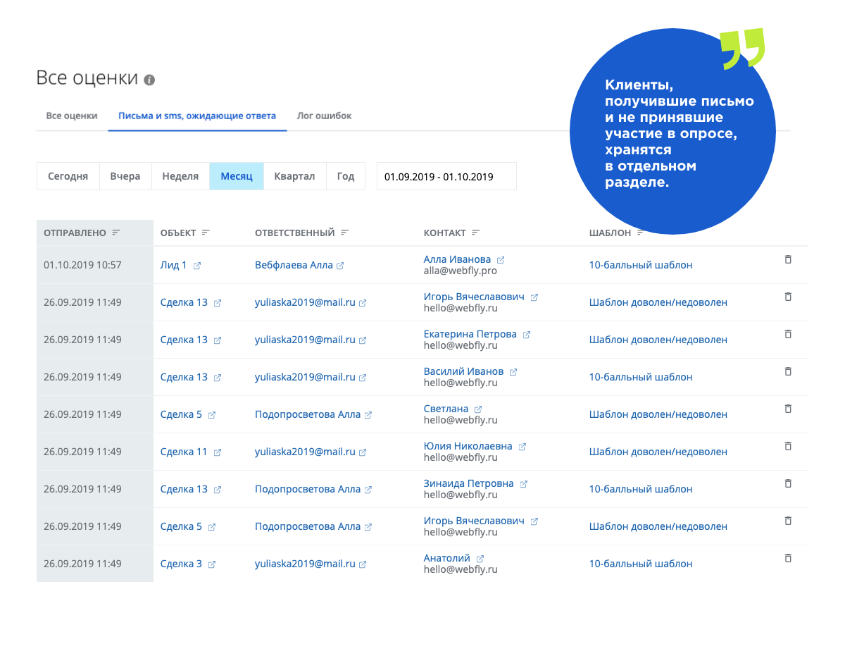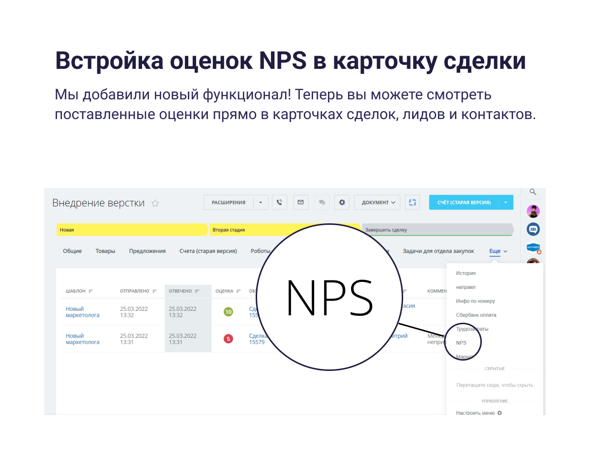 Модуль позволяет организовать процесс автоматизированного сбора оценок с клиентов в вашей CRM. Для этого модуль автоматически отправляет на электронную почту, SMS (Viber) и через любой подключенный внешний коннектор (например whatsapp, онлайн-чат и тд) вашим клиентам сообщение с просьбой оценить работу вашей компании.