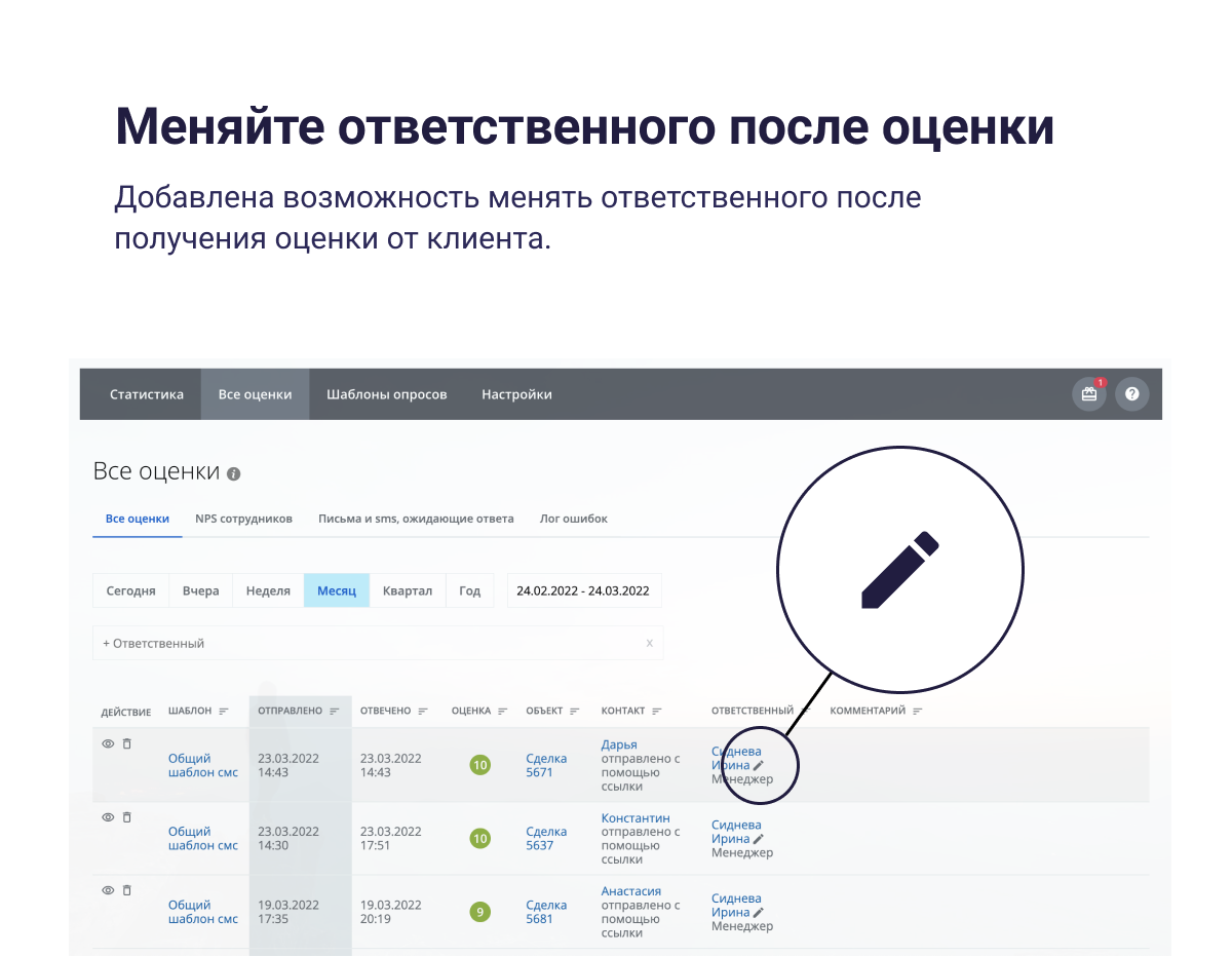 Для плохих оценок: можете сделать автоматическую постановку задачи на ответственного сотрудника, чтобы разобраться с причиной проблемы и исправить ситуацию в лучшую сторону.