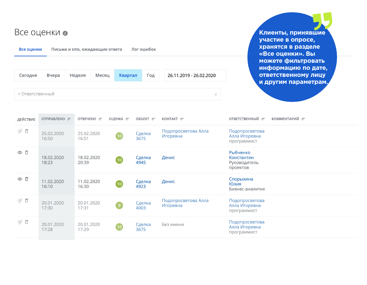У клиента появляется возможность прямо в своей электронной почте поставить оценку вашей работе и написать свой комментарий. Эта информация попадает обратно в модуль в вашем портале, где вы можете получить статистику по компании в целом, конкретному сотруднику.