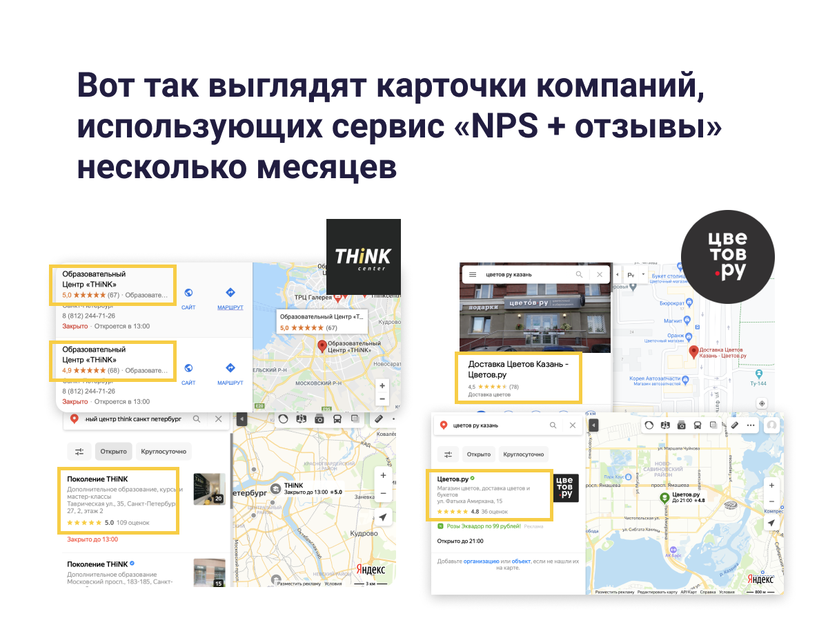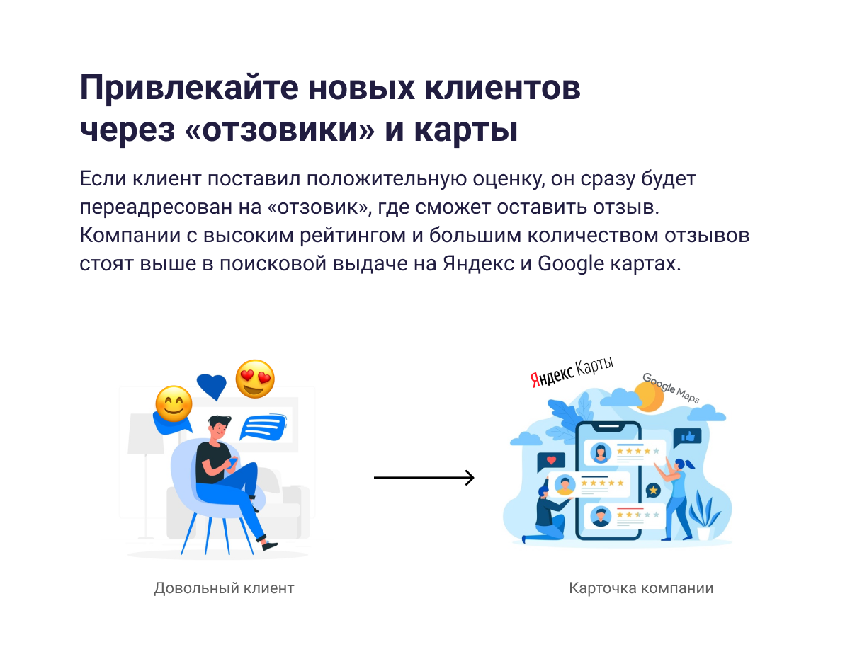 Если оценка положительная, система предложит оставить отзыв на организацию в Яндекс.Картах, Google.Картах или перенаправлять на нужный отзовик. Мы реализовали возможность генерации позитивных отзывов клиентов о вашей компании на нужных вам площадках! Повышайте рейтинг в публичных справочниках, пусть о вас узнают все.