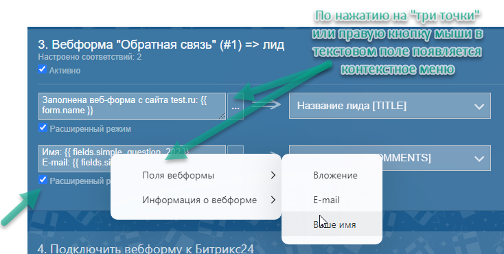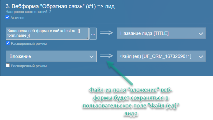 - Гибкая настройка соответствий полей (можно грузить несколько полей веб-формы в одно поле лида; можно грузить текстовые свойства в списки с автоматическим созданием недостающих значений в списках Битрикс24);
