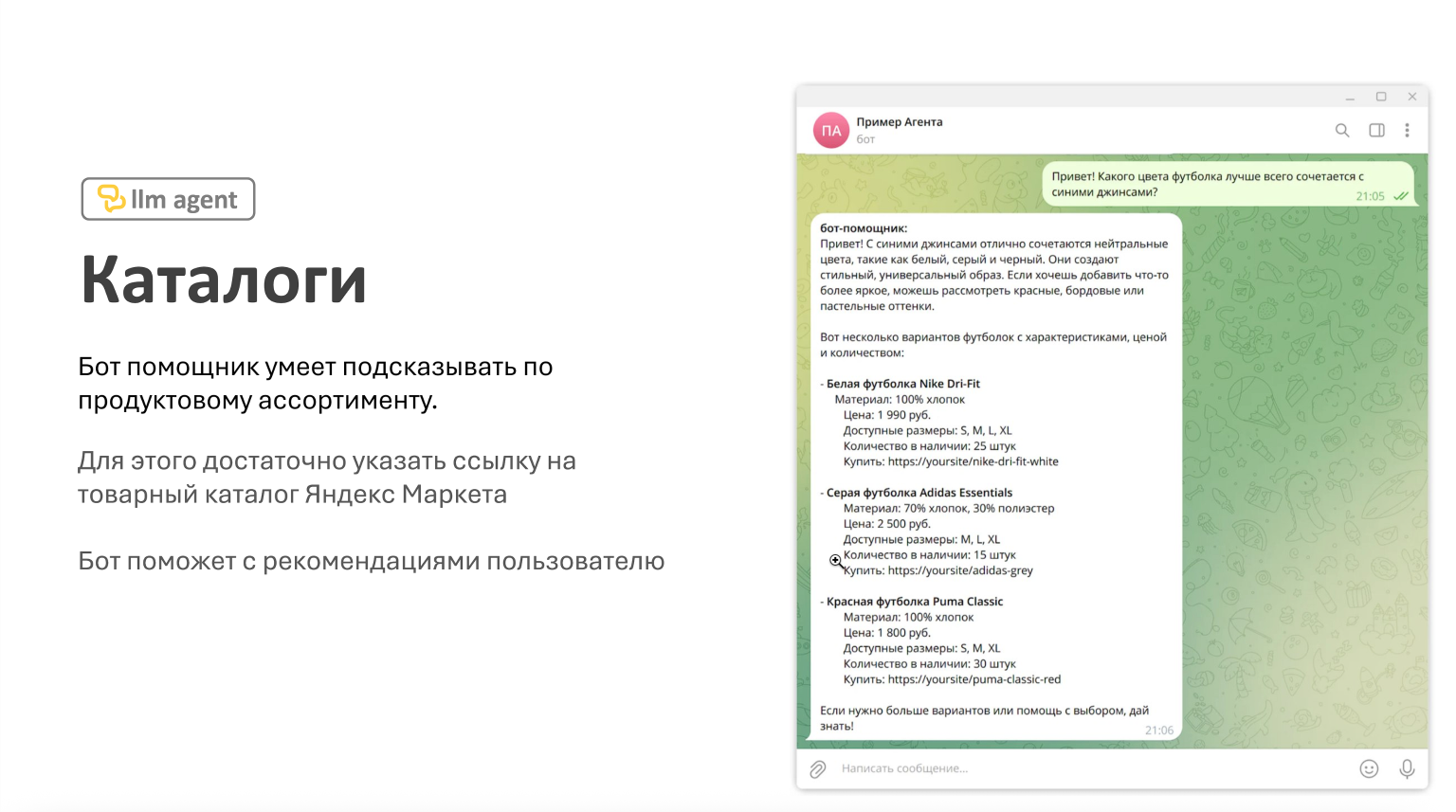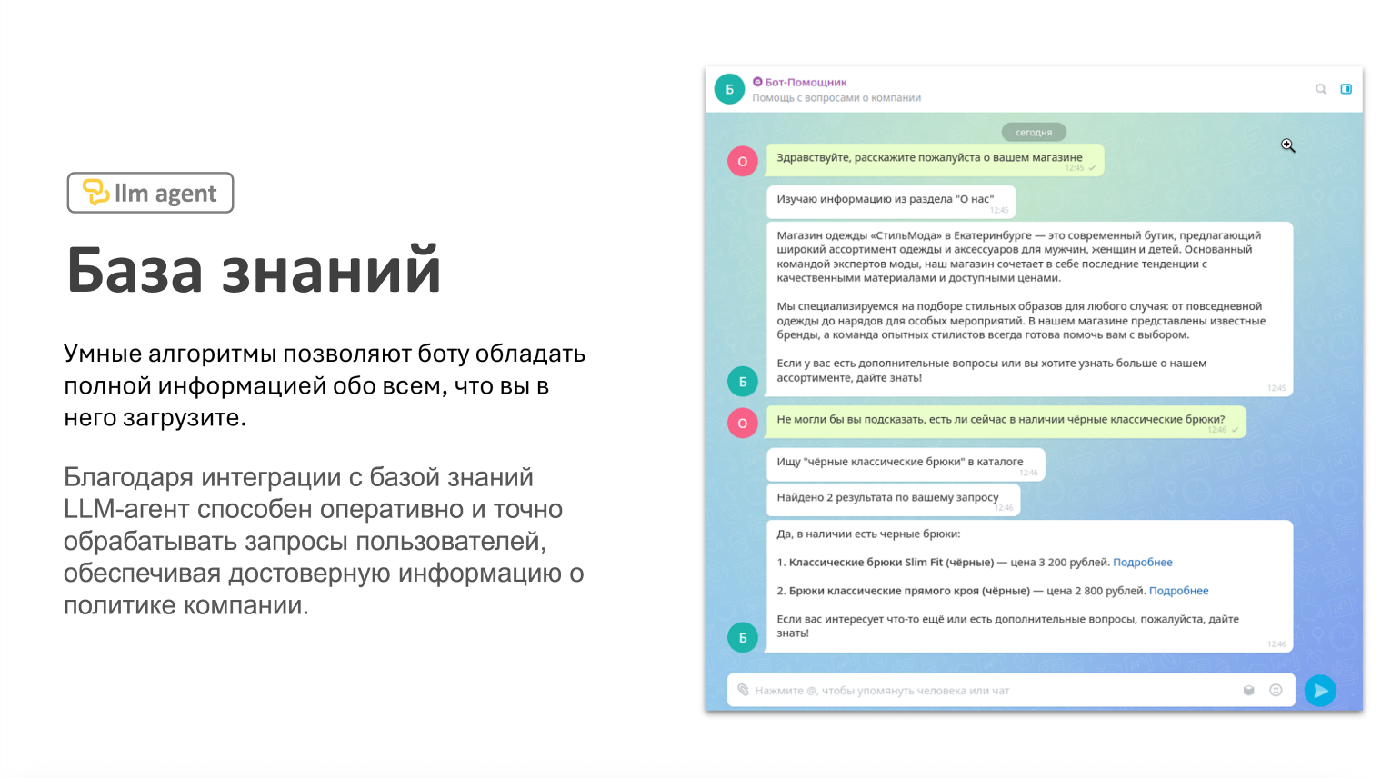 LLM Agent — это современный AI-бот, который работает круглосуточно, мгновенно отвечает на вопросы и помогает вашим клиентам сделать выбор быстрее.