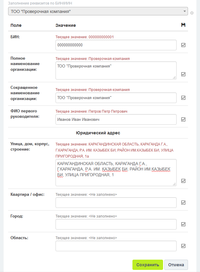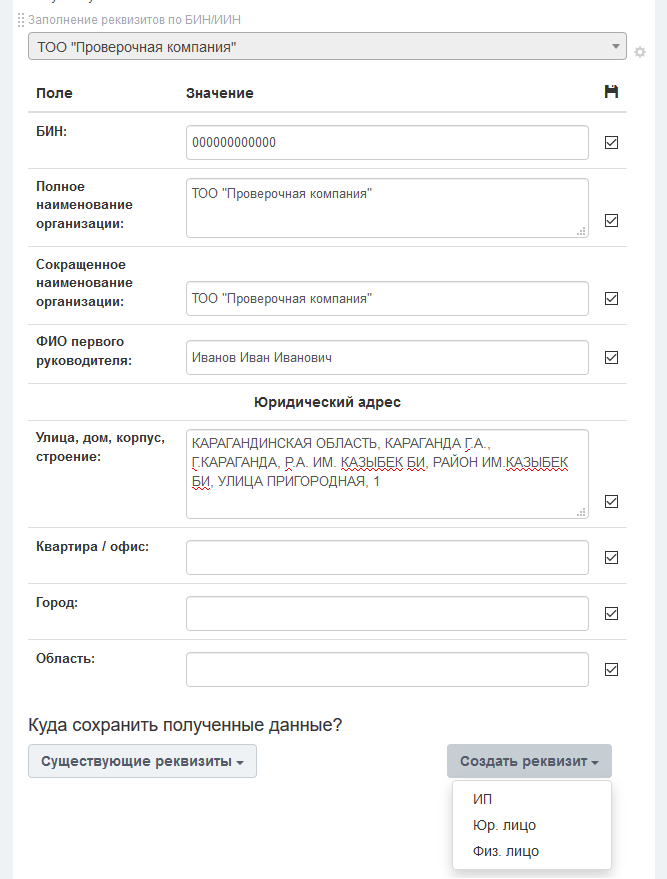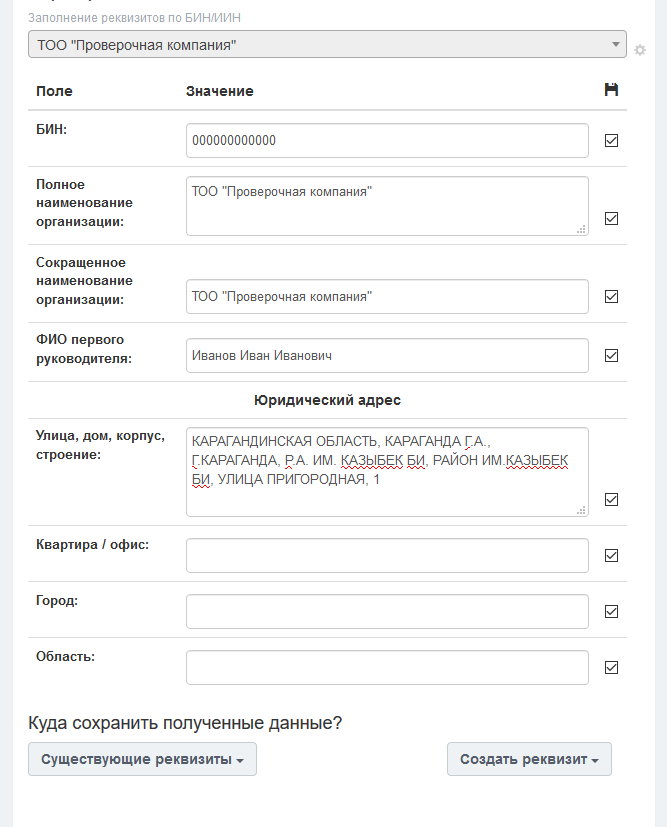 Таким образом, вы получаете возможность искать реквизиты компаний по БИН/ИИН, сохранять эти реквизиты или изменять уже имеющиеся.