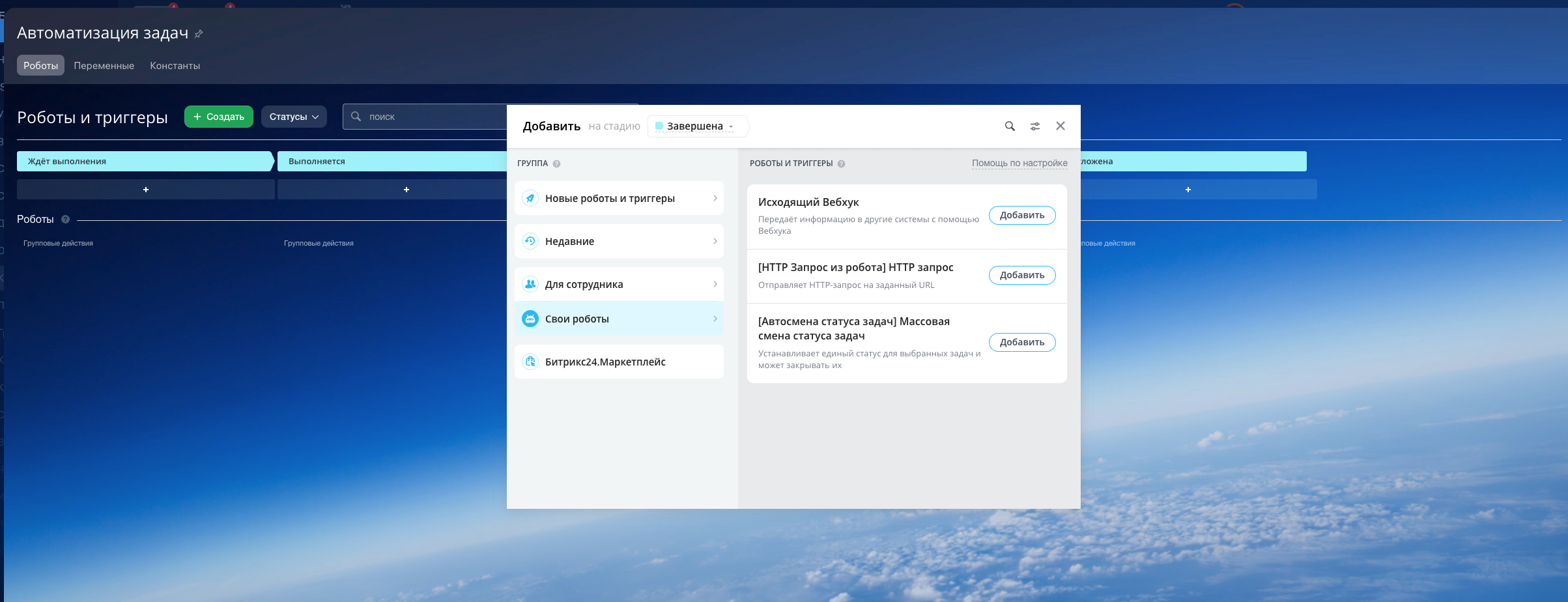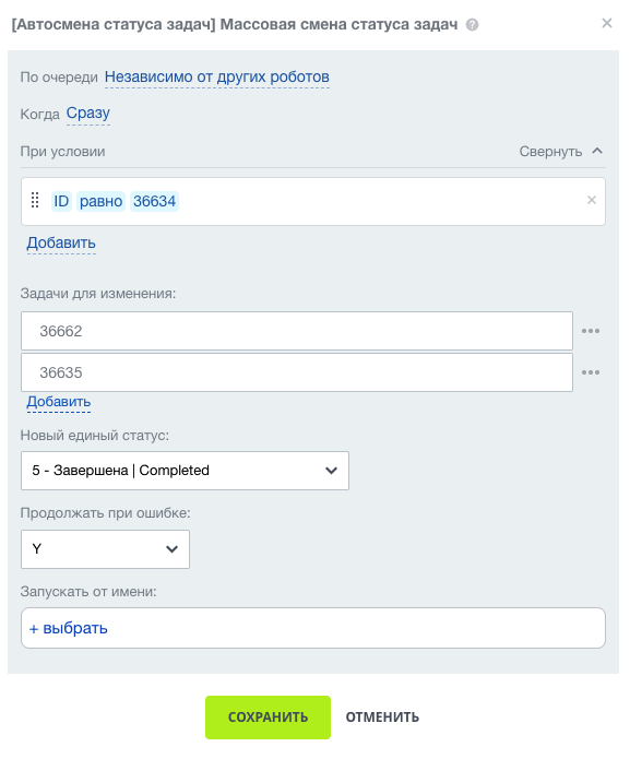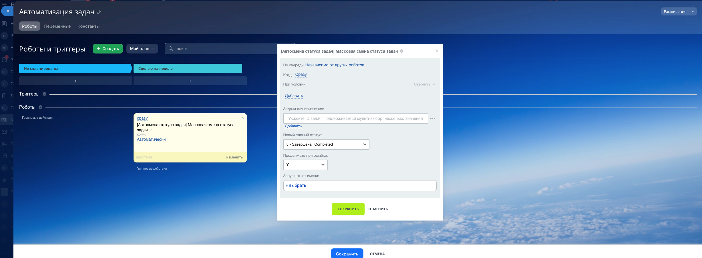 - если выбран статус 5 (Завершена), робот закрывает задачи через tasks.task.complete;