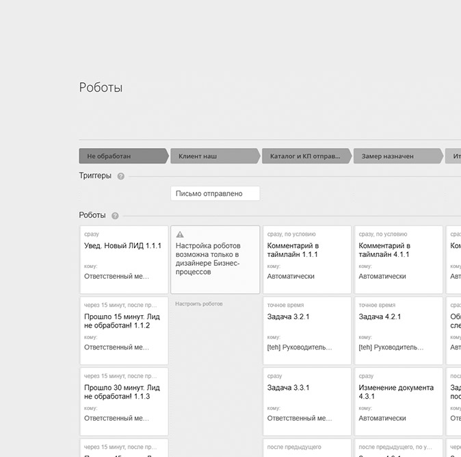 В CRM постоянно работает 100 роботов, которые помогают Ваши сотрудникам вести дела и сделки: проверка полей, проверка дат связи с лидом, выездом на замер, выездом на монтаж, вывод обучения, обновления названия лидов и сделок и многое другое.