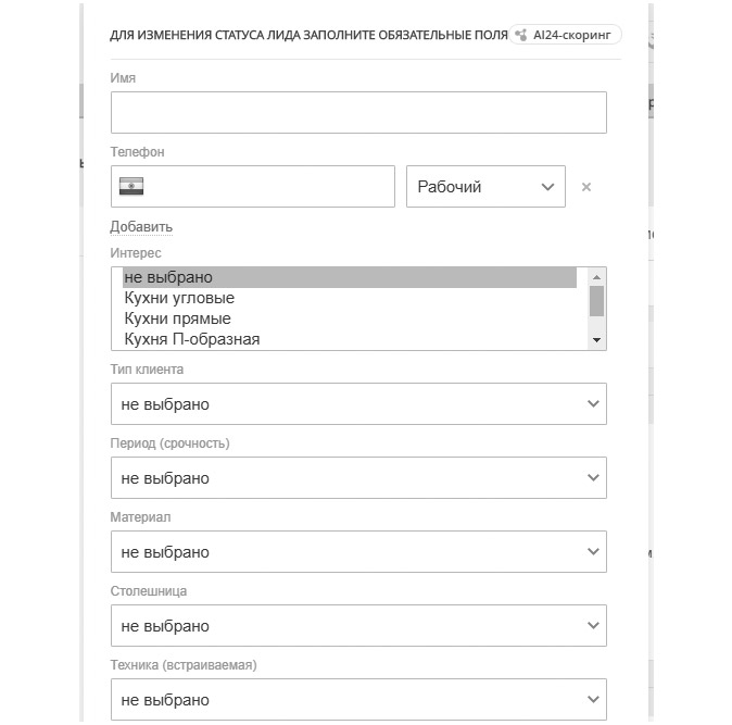- Карточка ЛИДа содержит поля, которые позволяют сделать выводы и потенциале намерениях клиента: Планируемый бюджет; О каких сроках покупки идет речь; О материалах на корпуса и столешницу; И так далее...
