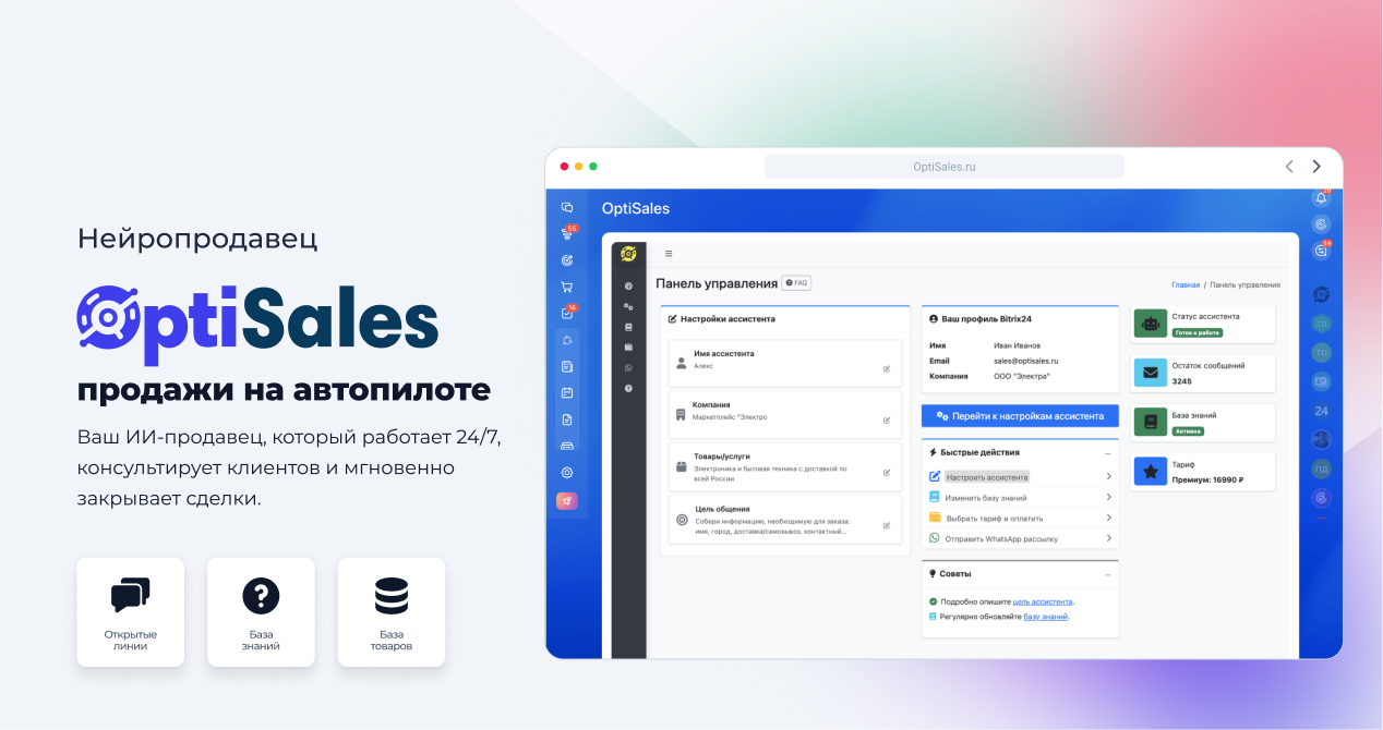 OptiSales – это ваш ИИ сотрудник прямо в Открытых Линии Битрикс24 и превращает их в круглосуточный отдел продаж и поддержки.