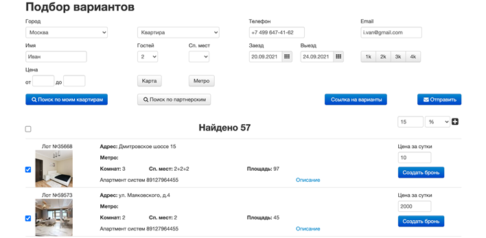 2. Мгновенный подбор вариантов размещения по запросам гостя.Опция “Подобрать варианты” поможет оперативно предложить гостю подходящие ему объекты размещения.
