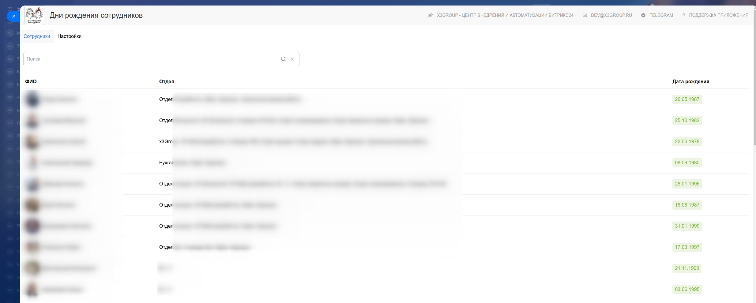 Для удобства отслеживания и установки даты рождения в приложении выводится список всех сотрудников с возможностью установки даты рождения там же.
