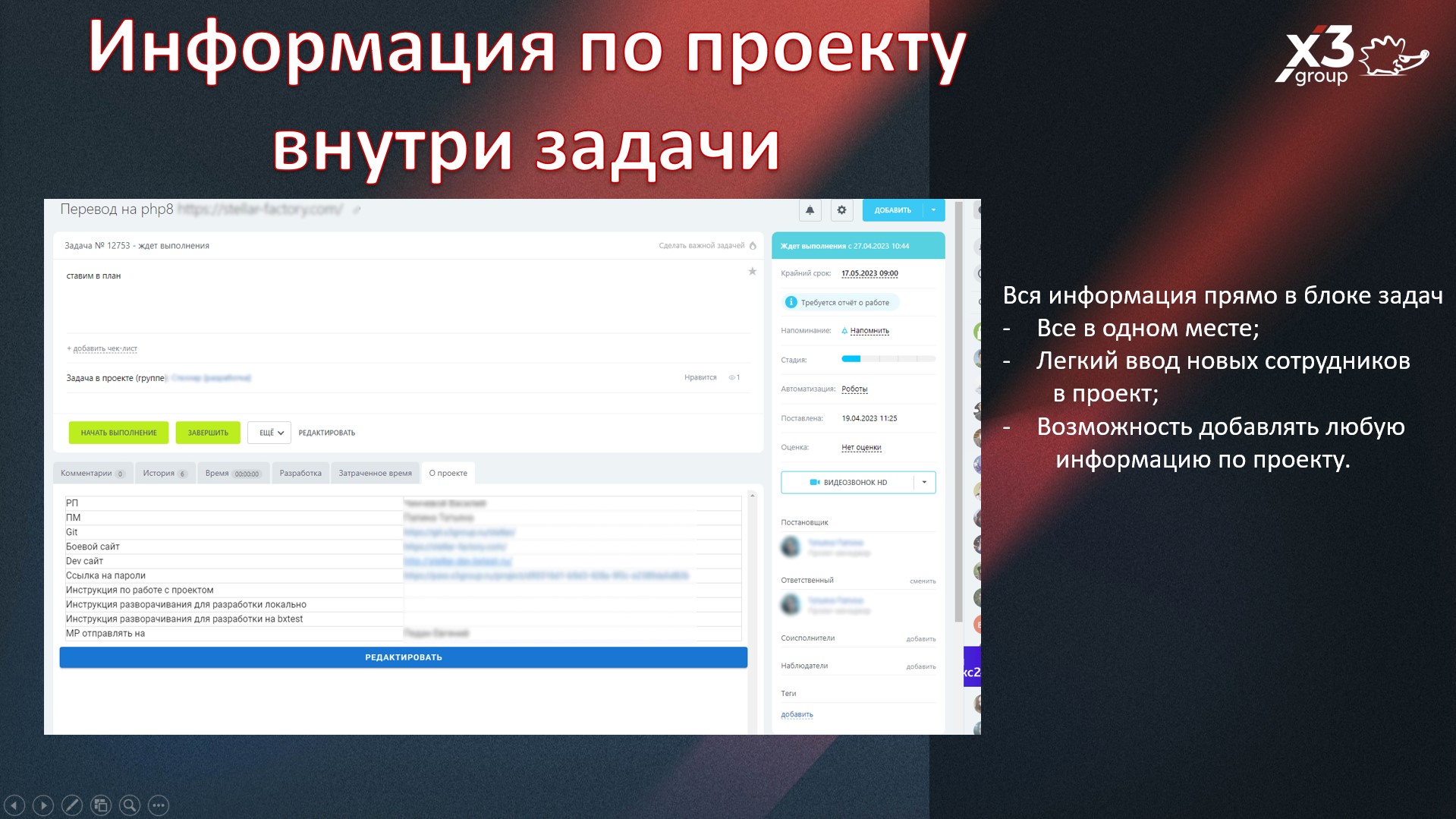 В задачи интегрируется вкладка, в которой хранится вся информация по проекту. Больше не будет такого, что сотрудник ушел в отпуск и проект завис из-за нехватки знаний.