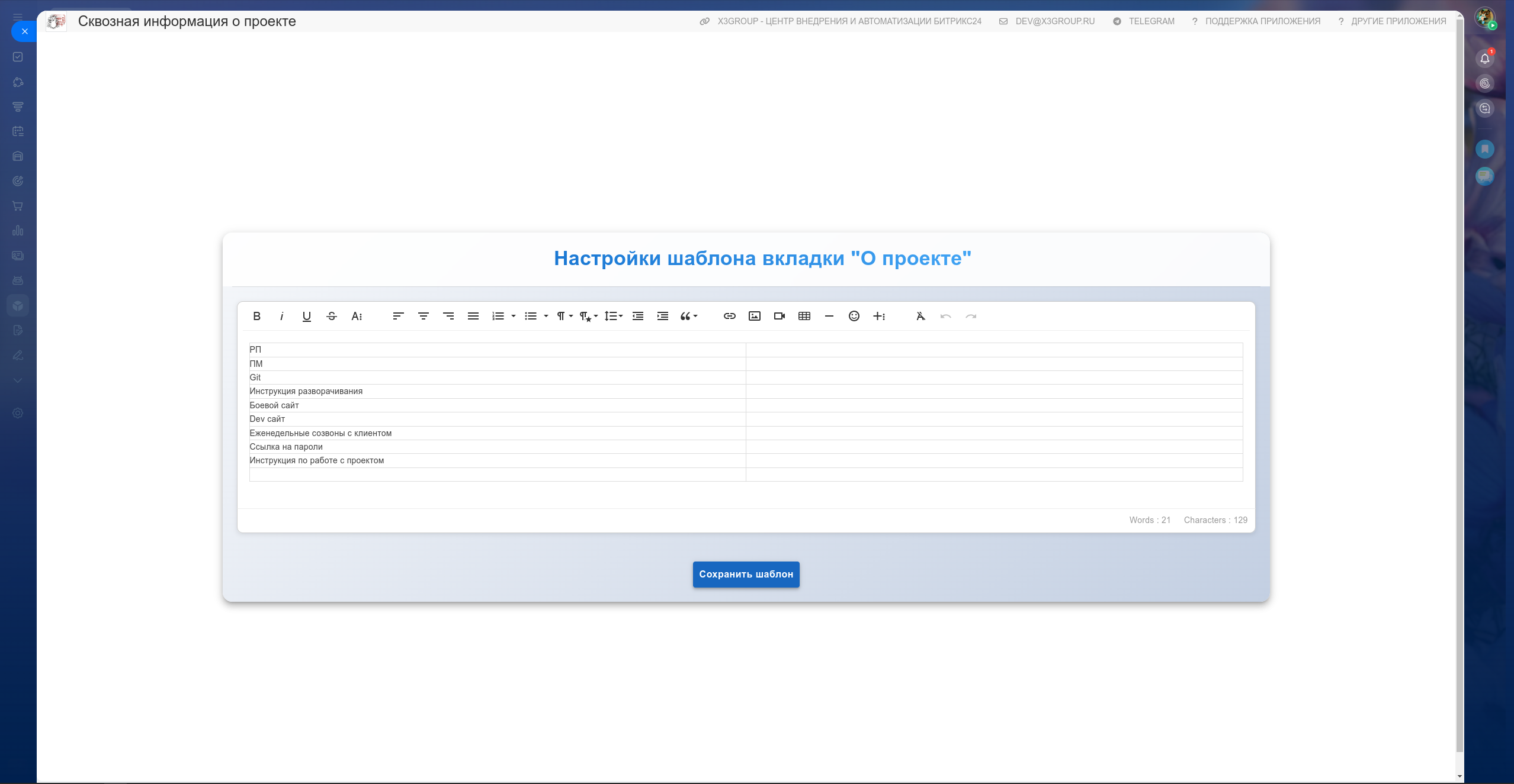 Приложение «Сквозная информация по проекту» упрощает работу команд в Битрикс24, позволяя хранить и быстро находить ключевые данные по проекту в одном месте.